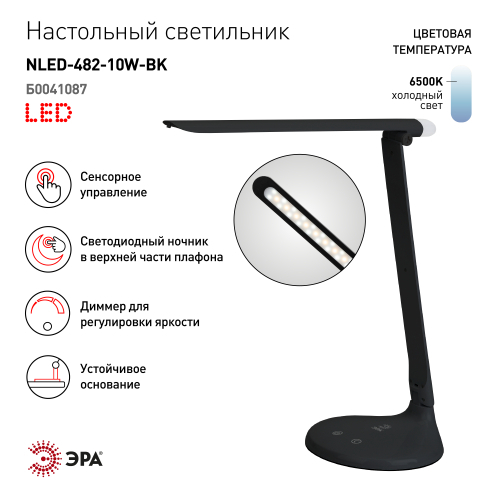 Настольный светильник ЭРА NLED-482-10W-BK - удобная складная модель с сенсорным управлением, с тремя уровнями яркости и светодиодным ночником в верхней части плафона. Светит холодным белым светом, который бодрит и повышает работоспособность. Ночник в верхней части плафона имеет отдельный сенсорный выключатель на основании.