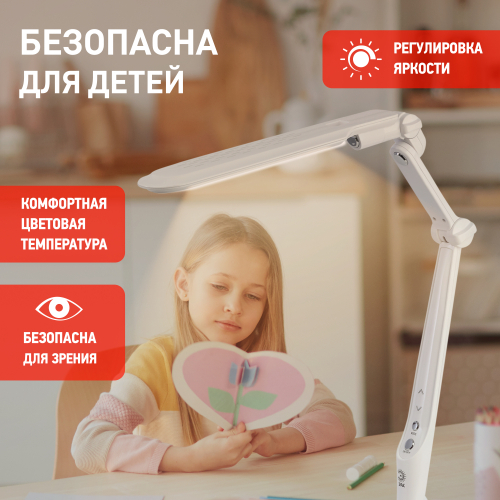 Настольный светильник ЭРА NLED-496-12W-W со светодиодами (LED) в качестве источников света. Оснащен сенсорным управлением с возможностью выбора цветовой температуры (теплый, нейтральный или холодный свет). Плавный диммер для регулировки яркости. Светильник сохраняет выбранные настройки при включении-выключении. Высота плафона регулируется двухсекционной сгибающейся стойкой, направление света регулируется поворотом и наклоном плафона в любую сторону. Удобное крепление на струбцину.