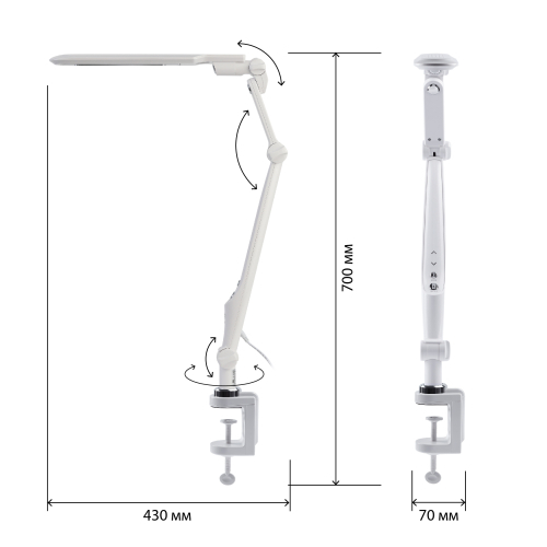 Настольный светильник со светодиодами (LED) в качестве источников света. Выбор цветовой температуры - 3 цвета: 3000К, 4500К, 6000К. Сенсорный переключатель на стойке. Плавный диммер для регулировки яркости. Светильник сохраняет выбранные настройки при включении-выключении. Высота плафона регулируется двухсекционной сгибающейся стойкой, направление света регулируется поворотом и наклоном плафона в любую сторону. Модель на струбцине.