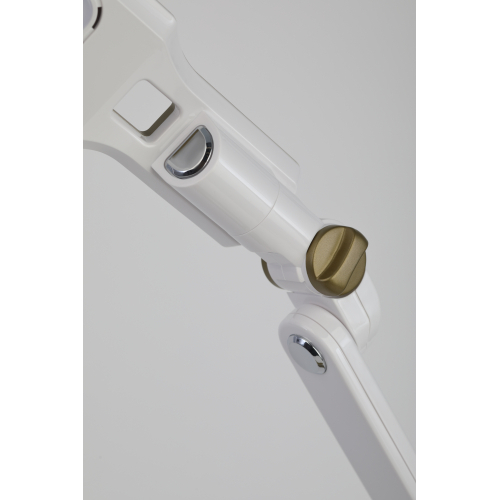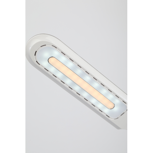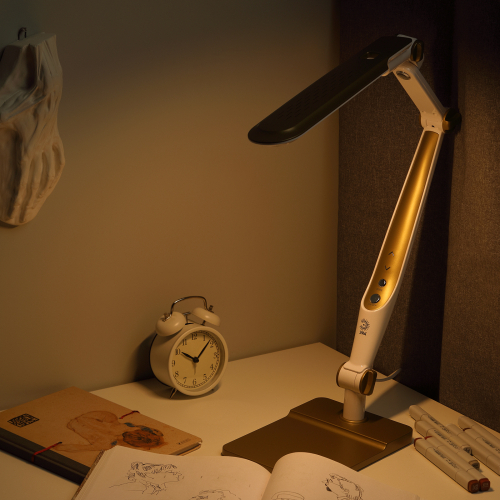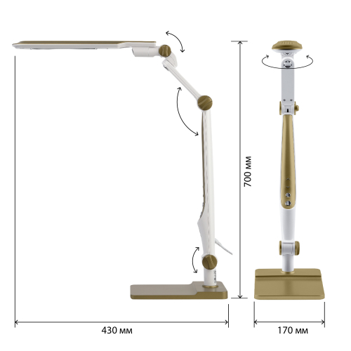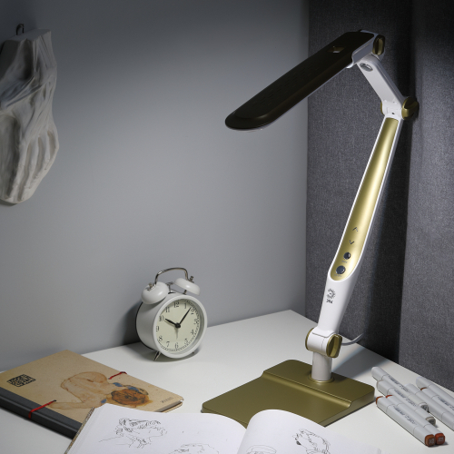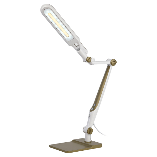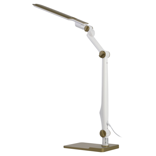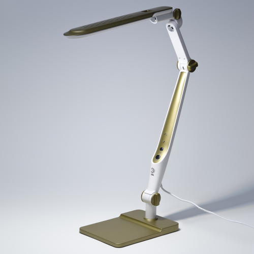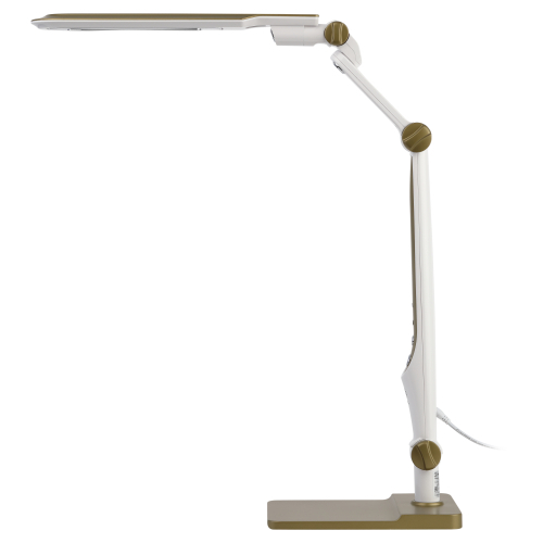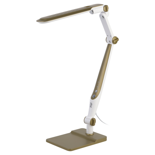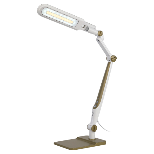 Настольный светильник со светодиодами (LED) в качестве источников света. Выбор цветовой температуры - 3 цвета: 3000К, 4500К, 6000К. Сенсорный переключатель на стойке. Плавный диммер для регулировки яркости. Светильник сохраняет выбранные настройки при включении-выключении. Высота плафона регулируется двухсекционной сгибающейся стойкой, направление света регулируется поворотом и наклоном плафона в любую сторону. Два варианта крепления в комплекте: основание, струбцина.