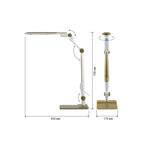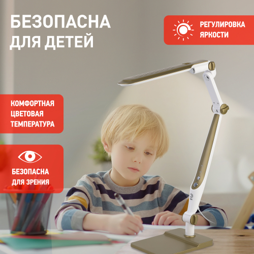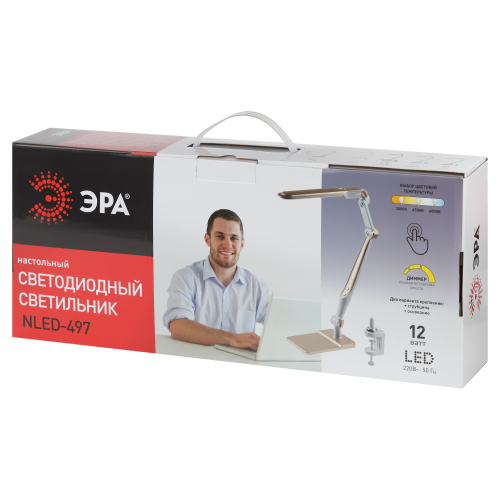 Настольный светильник ЭРА NLED-497-12W-G со светодиодами (LED) в качестве источников света. Оснащен сенсорным управлением с возможностью выбора цветовой температуры (теплый, нейтральный или холодный свет). Плавный диммер для регулировки яркости. Светильник сохраняет выбранные настройки при включении-выключении. Высота плафона регулируется двухсекционной сгибающейся стойкой, направление света регулируется поворотом и наклоном плафона в любую сторону. Два варианта крепления в комплекте: устойчивое основание и струбцина.
