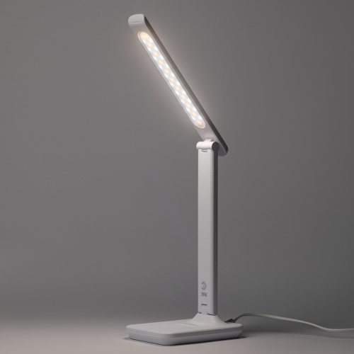 Настольный светильник со светодиодами (LED) в качестве источников света в дизайне под кожу . Выбор цветовой температуры - 3 цвета: 3000К, 4500К, 6000К. Сенсорный переключатель на основании. Плавный диммер для регулировки яркости. Складная конструкция.