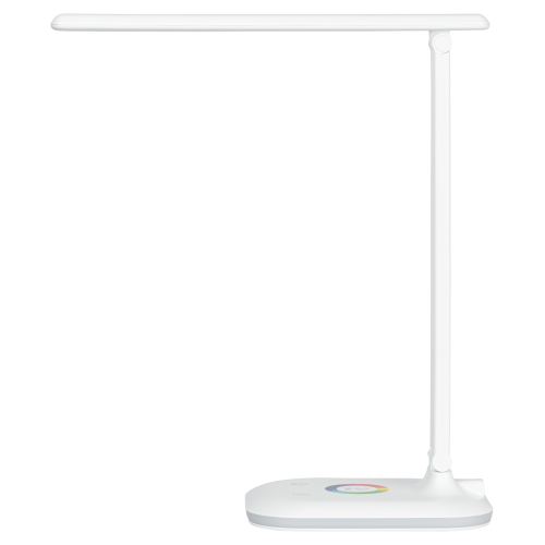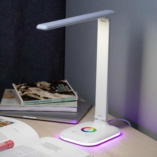 Настольный светильник со светодиодами (LED) в качестве источников света. Выбор цветовой температуры - 3 цвета: 3000К, 4500К, 6000К. Сенсорный переключатель на основании. Плавный диммер для регулировки яркости. RGB LED ночник на основании с независимым сенсорным переключателем, с выбором режимов свечения. Складная конструкция.