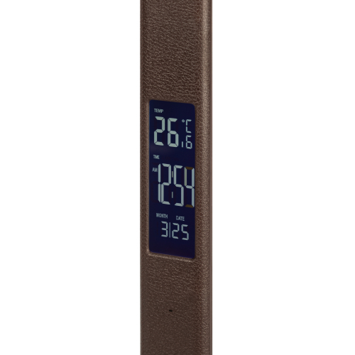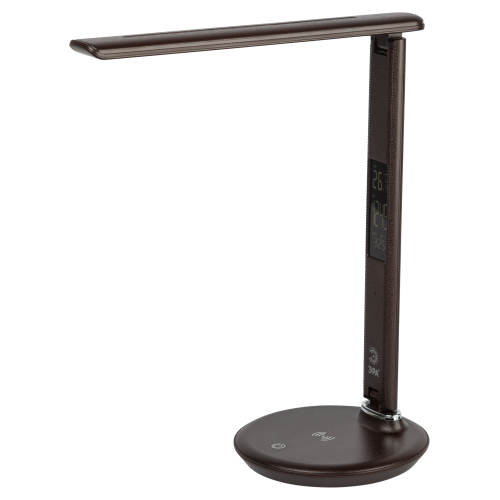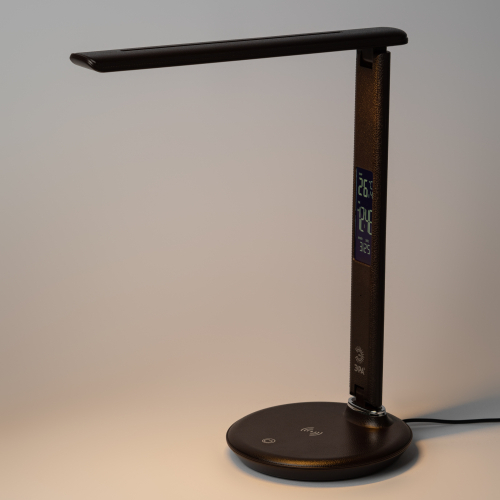 Настольный светильник со светодиодами (LED) в качестве источников света в дизайне под кожу . Выбор цветовой температуры - 3 цвета: 3000К, 4500К, 6000К. Сенсорный переключатель на основании. Плавный диммер для регулировки яркости. Встроенный USB порт для зарядки мобильных устройств, встроенный модуль Qi для беспроводной зарядки. Многофункциональный дисплей: часы, будильник, дата, день недели, термометр. Складная конструкция.