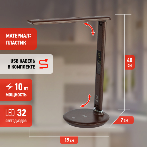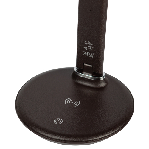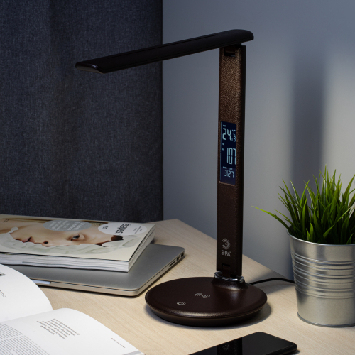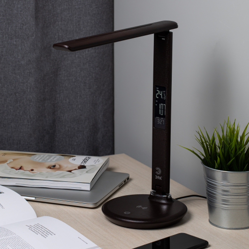 Премиальный складной настольный светильник ЭРА NLED-505 оснащен USB портом и модулем Qi для беспроводной зарядки мобильных устройств, а также ЖК дисплеем с функциями часов, будильника, календаря и термометра. Сенсорное управление обеспечивает выбор цветовой температуры света и плавную регулировку яркости. Поверхность светильника тактильно приятной фактуры под кожу. Направление света регулируется за счет наклона стойки и плафона до 180°.