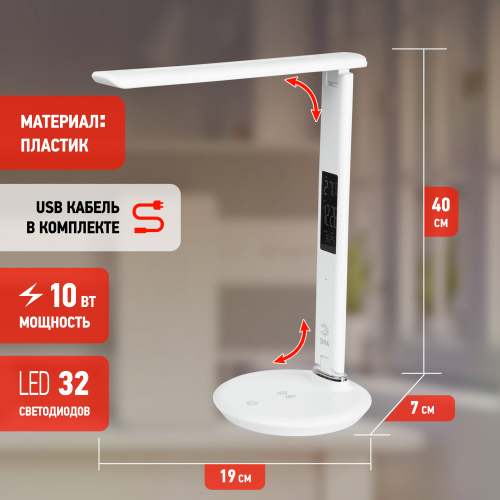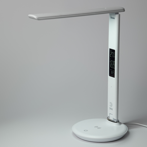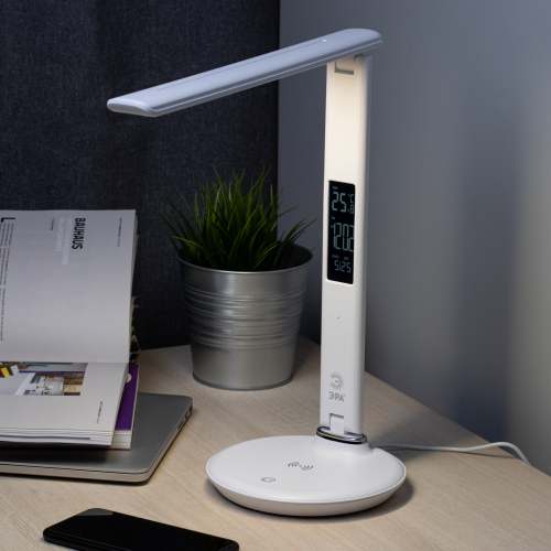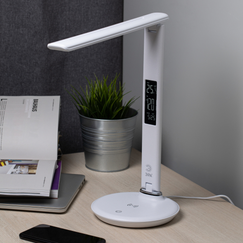 Премиальный складной настольный светильник ЭРА NLED-505 оснащен USB портом и модулем Qi для беспроводной зарядки мобильных устройств, а также ЖК дисплеем с функциями часов, будильника, календаря и термометра. Сенсорное управление обеспечивает выбор цветовой температуры света и плавную регулировку яркости. Поверхность светильника тактильно приятной фактуры под кожу. Направление света регулируется за счет наклона стойки и плафона до 180°.