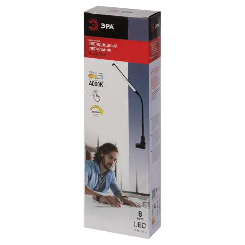 Настольный светильник со светодиодами (LED) в качестве источников света, 8 Вт. Модель на струбцине с сенсорным переключателем на плафоне. Плавная регулировки яркости. Высота плафона регулируется гибкой стойкой. Нейтральный белый свет - цветовая температура 4000К.