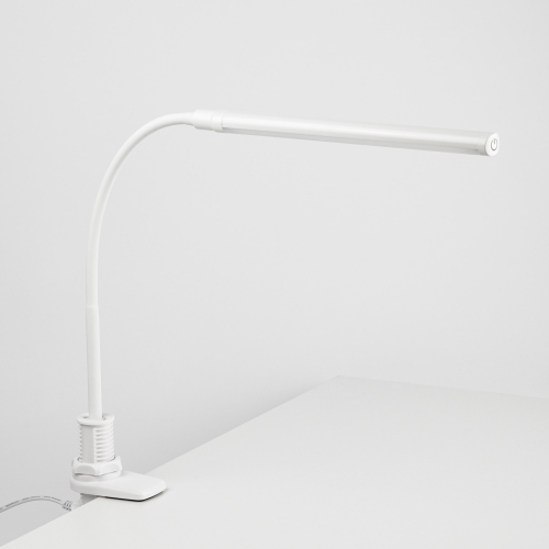 Настольный светильник со светодиодами (LED) в качестве источников света, 8 Вт. Модель на струбцине с сенсорным переключателем на плафоне. Плавная регулировки яркости. Высота плафона регулируется гибкой стойкой. Нейтральный белый свет - цветовая температура 4000К.