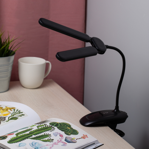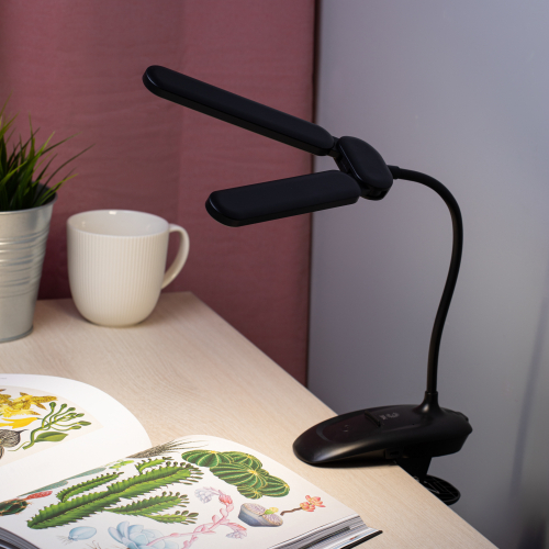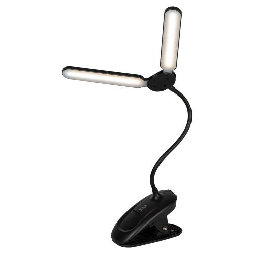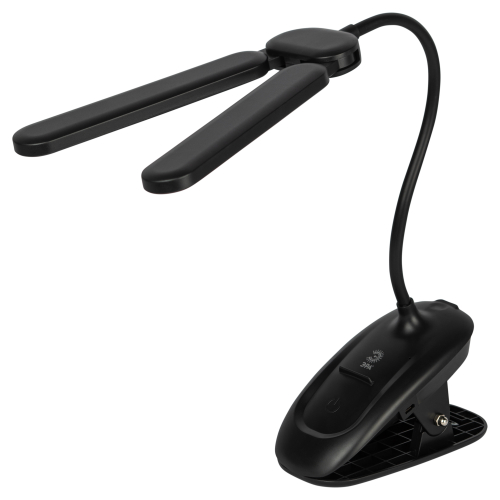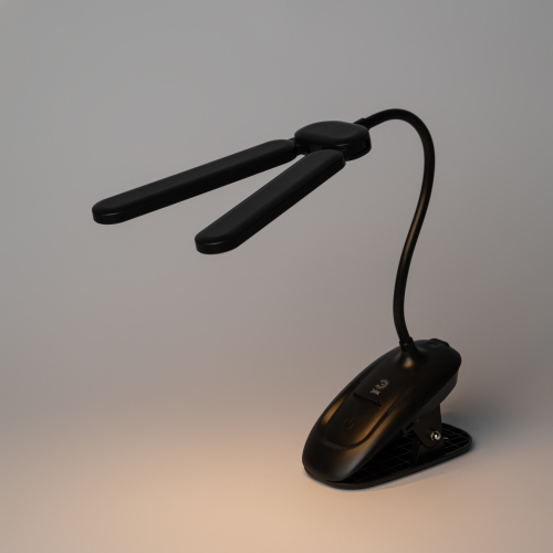 Настольный светильник с двойным плафоном со светодиодами (LED) в качестве источников света. На прищепке. Встроенный литиевый аккумулятор для автономной работы. Выбор цветовой температуры - 3 цвета: 3000К, 4500К, 6000К. Сенсорное переключение. Плавный диммер для регулировки яркости. Подзарядка от USB. USB кабель в комплекте. Гибкая стойка.