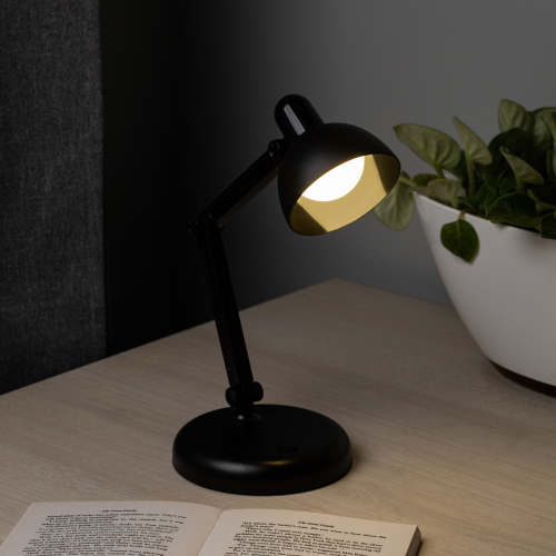 Настольный светильник со светодиодами (LED) в качестве источников света. Работает от элементов 3 х АА (не входят в комплект поставки) или от USB. USB кабель в комплекте. Выключатель на основании светильника. Нейтральный белый свет - цветовая температура 4000К.