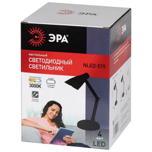 Настольный светильник NLED-515-4W-BK со светодиодами (LED) в качестве источников света. Работает от элементов 3 х АА (не входят в комплект поставки) или от USB.