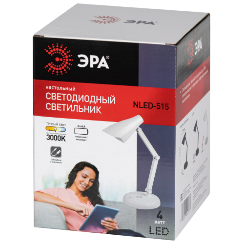 Настольный светильник NLED-515-4W-W со светодиодами (LED) в качестве источников света. Работает от элементов 3 х АА (не входят в комплект поставки) или от USB.