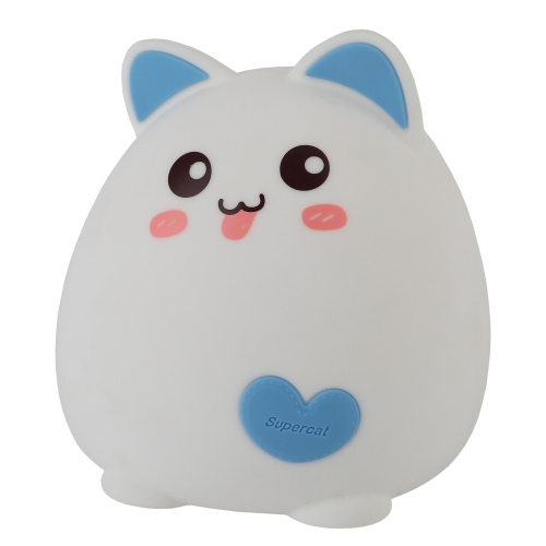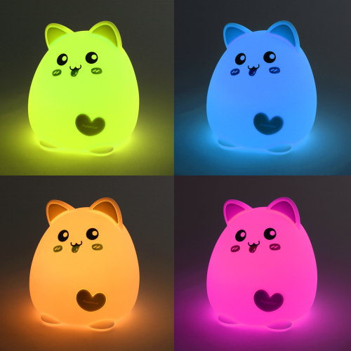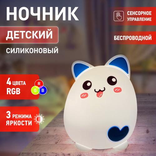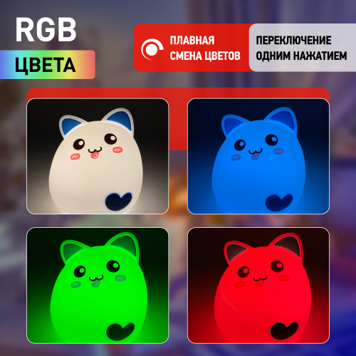 Светильник-ночник со светодиодами (LED) в качестве источников света. "Мягкий" материал. Работает от встроенного литиевого аккумулятора. Подзарядка от USB. USB кабель в комплекте. Выключатель для отключения/блокировки сенсора. 3 режима (переключение прикосновением): белый свет половина яркости, белый свет максимальная яркость, RGB c переходами цветов. Дизайн в виде котенка.