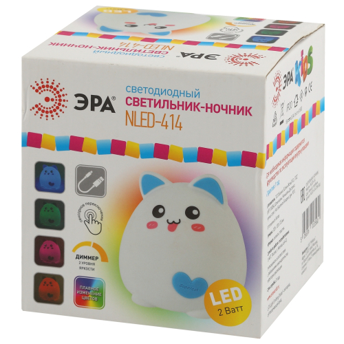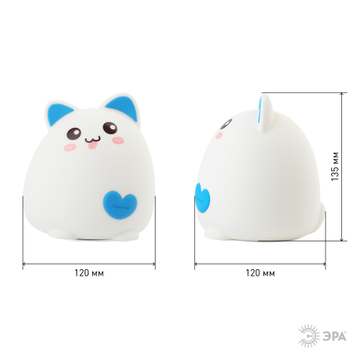 Мягкие светодиодные светильники-ночники ЭРА из силикона с приятным на ощупь покрытием софт-тач имеют милый дизайн в виде фигурок животных и популярны как среди детей, так и среди взрослых. Режим плавной смены цветов завораживает, оказывает успокаивающий эффект, помогает бороться со стрессом и быстро засыпать. На эти светильники радостно смотреть, их приятно держать в руках. Они трогательные во всех смыслах - речь и о необычном оформлении корпуса, и о сенсорном способе управления. Пара прикосновений или легкое постукивание - и вот ночник уже изменил цвет свечения или режим работы. ЭРА NLED-414-2W-BU Котик работает от встроенного литиевого аккумулятора, который легко подзарядить от USB с помощью входящего в комплект USB кабеля. У Котика 3 режима: белый свет с 50% яркости, белый свет с максимальной яркостью, RGB c переходами цветов. А еще у него очаровательная мордочка - Котик "показывает язык"! - и цветные синие ушки, а на мягком кошачьем пузике синее сердечко.