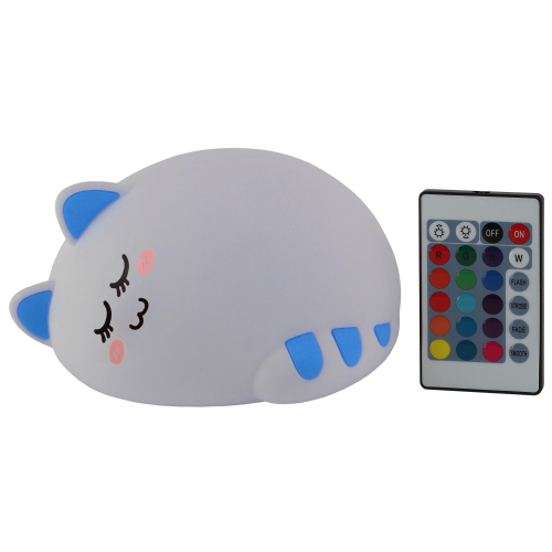 Светильник-ночник со светодиодами (LED) в качестве источников света. Мягкий" материал. Работает от встроенного литиевого аккумулятора. Подзарядка от USB. USB кабель в комплекте. Управление от ПУЛЬТА ДИСТАНЦИОННОГО УПРАВЛЕНИЯ, или сенсорное переключение от прикосновения к ночнику. Выключатель для отключения/блокировки сенсора. 3 режима (переключение прикосновением): белый свет половина яркости, белый свет максимальная яркость, RGB c переходами цветов. ПУЛЬТ ДИСТАЦИОННОГО УПРАВЛЕНИЯ позволяет включать/выключать светильник, выбрать цвет свечения, изменять яркость и режим перемены цветов. Дизайн в виде котенка.