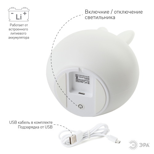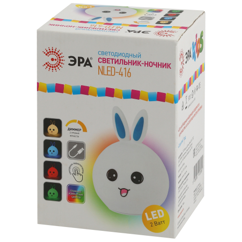 Силиконовая игрушка-ночник ЭРА NLED-416-2W-BU в виде зайчика с восхитительной улыбкой. Этот светодиодный светильник настольный легко впишется в декор спальни, поможет малышу быстро заснуть и сделает уютным интерьер. У светильника-ночника несколько режимов: белый, красный, зеленый или синий цвет свечения на выбор, а также завораживающая смена ярких цветов. Выбирать тип света можно через касание - а делать это вдвойне удобно за счет нежного силикона. Ребенок может мягко сжимать игрушку при переключении цветов: она поможет снять стресс после изнурительного дня. Аккумуляторная лампа-ночник не зависит от проводов: подзарядите его, а потом возьмите с собой в детскую комнату или поставьте в спальню на тумбочку. Выбрав светящегося зайчика от торговой марки ЭРА, вы получите идеальный презент и для себя, и для своего непоседы. Найдите место для верного друга у себя дома!