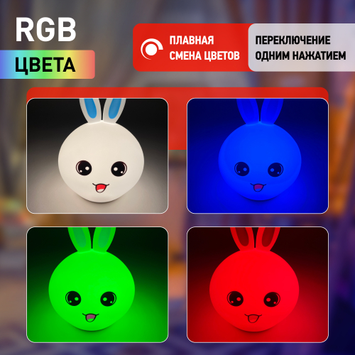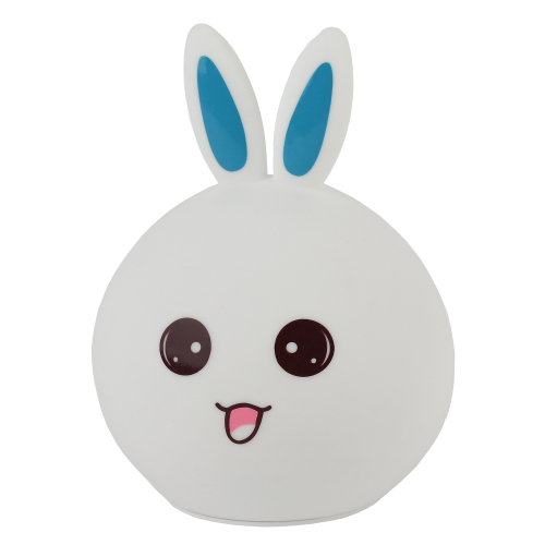 Светильник-ночник со светодиодами (LED) в качестве источников света. "Мягкий" материал. Работает от встроенного литиевого аккумулятора. Подзарядка от USB. USB кабель в комплекте. Выключатель для отключения/блокировки сенсора. 3 режима (переключение прикосновением): белый свет половина яркости, белый свет максимальная яркость, RGB c переходами цветов. Дизайн в виде зайца.