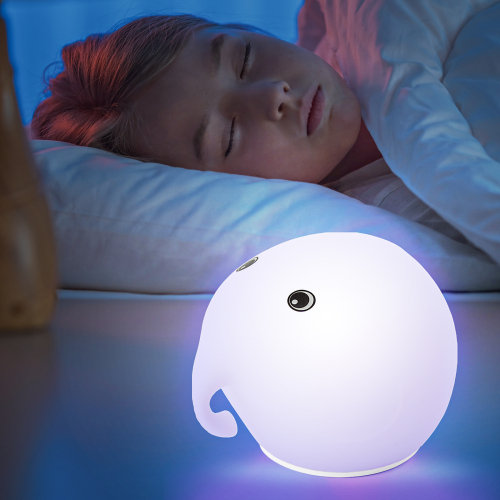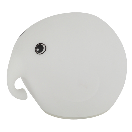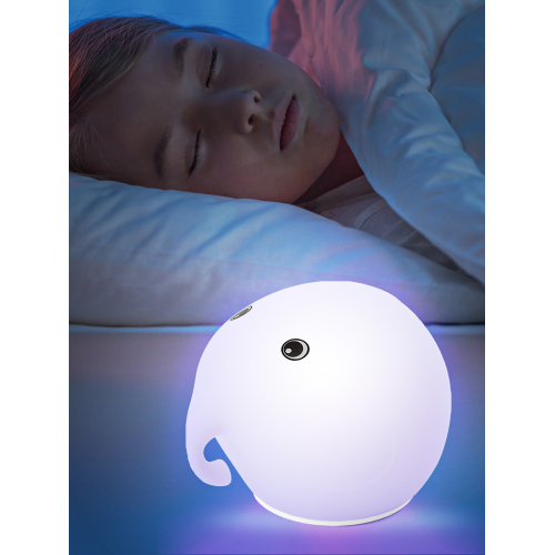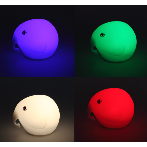 Светильник-ночник со светодиодами (LED) в качестве источников света. "Мягкий" материал. Работает от встроенного литиевого аккумулятора. Подзарядка от USB. USB кабель в комплекте. Выключатель для отключения/блокировки сенсора. 5 режимов (переключение прикосновением): белый свет, красный свет, зеленый свет, синий свет, смена разных цветов. Дизайн в виде слоника.