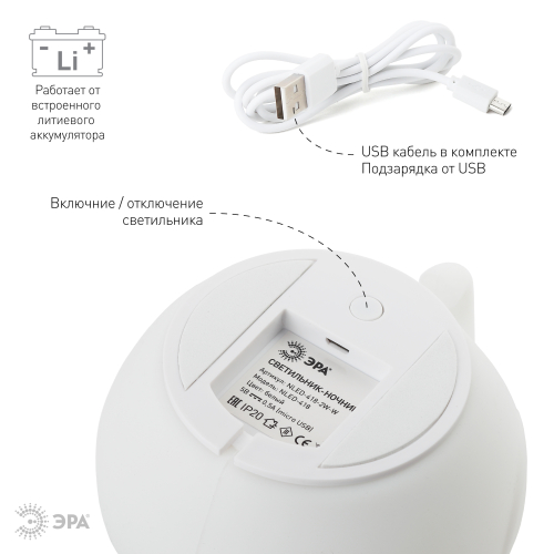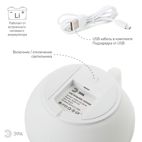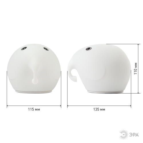 Светодиодный мягкий ночник ЭРА NLED-418-2W-W "Слоник" работает от встроенного литиевого аккумулятора и подзаряжается от USB, кабель для подзарядки в комплекте. Есть выключатель для отключения ночника и блокировки сенсора от случайного срабатывания, чтобы ночник не включился при перевозке или хранении. У Слоника 5 режимов работы: белый, красный, зеленый или синий цвет свечения на выбор, а также смена разных цветов. Мягкие светильники-ночники ЭРА из силикона с приятным на ощупь покрытием софт-тач имеют милый дизайн в виде фигурок животных и популярны как среди детей, так и среди взрослых. Режим плавной смены цветов завораживает, оказывает успокаивающий эффект, помогает бороться со стрессом и быстро засыпать. На эти светильники радостно смотреть, их приятно держать в руках. Они трогательные во всех смыслах - речь и о необычном оформлении корпуса, и о сенсорном способе управления. Пара прикосновений или легкое постукивание - и вот ночник уже изменил цвет свечения или режим работы.