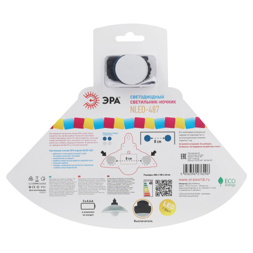 Светильник-ночник со светодиодами (LED) в качестве источников света. Автономный, работает от элементов питания 3 х ААА (не входят в комплект поставки). Выключатель на корпусе. Магнитные стикеры в комплекте с возможностью крепления к любому типу поверхностей. Легко снимать для подзарядки. Шнур 1 м в комплекте для возможного варианта подвеса. Легкий доступ к батарейкам для замены. Блистерная упаковка с евроотверстием.