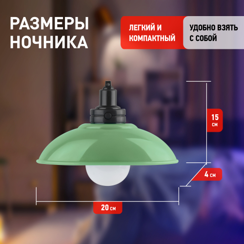 Автономный светильник-ночник на стену ЭРА NLED-487-1W-SW-GR со светодиодами (LED), с выключателем на корпусе, зеленого цвета. Дизайн корпуса ночника выполнен в форме подвесного светильника в стиле ретро. Светильник автономный, работает от элементов питания 3 х ААА (не входят в комплект поставки). Светильник легко крепится к любому типу поверхностей и легко снимается для подзарядки благодаря магнитным стикерам, входящим в комплект. Светильник можно подвесить при помощи шнура длиной 1 м (в комплекте): в верхней части светильника имеется удобное отверстие для подвеса. Светодиодный светильник-ночник ЭРА станет отличным элементом декора и создаст яркую подсветку там, где вам удобно! Легкий доступ к батарейкам для замены. Поставляется в блистерной упаковке с евроотверстием.