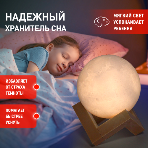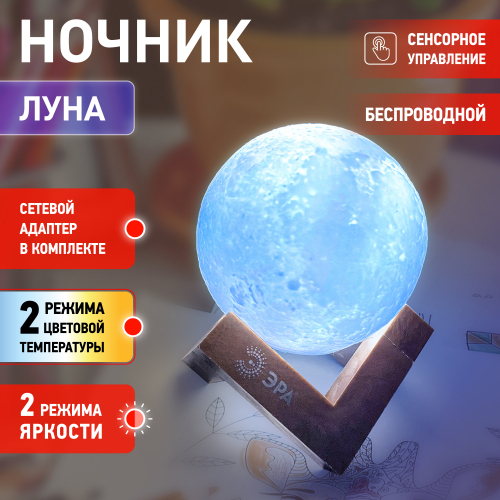 Светодиодный ночник с необычным дизайном: ночи при луне прямо у вас дома! Отличный подарок к любому празднику. В числе преимуществ - литиевый аккумулятор, сенсорное переключение и подзарядка от USB. Луна не настоящая, но очень похожа. Поверхность ночника повторяет реальный рельеф спутника Земли. Приятное свечение комфортной яркости. Есть два варианта Луны - поменьше и побольше: NLED-490-1W-W диаметр шара 8 см; NLED-491-1W-W диаметр шара 15 см. Также модели различаются соответствующими шарику размерами сборной подставки, которая идет в комплекте. Подставка из пластика под цвет дерева. ЭРА Луна может светить теплым желтым или холодным белым светом переключается прикосновением. Просто возьмите ее в руки - и начнется ночная световая магия! Яркость свечения тоже регулируется, причем плавно (касаемся зоны управления рядом с портом для зарядки и удерживаем яркость изменяется). Есть возможность сделать свет очень мягким это важное преимущество, так как не все ночники можно притушить до еле видного свечения, не мешающего спать.