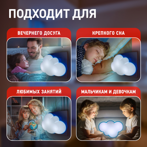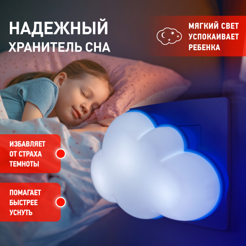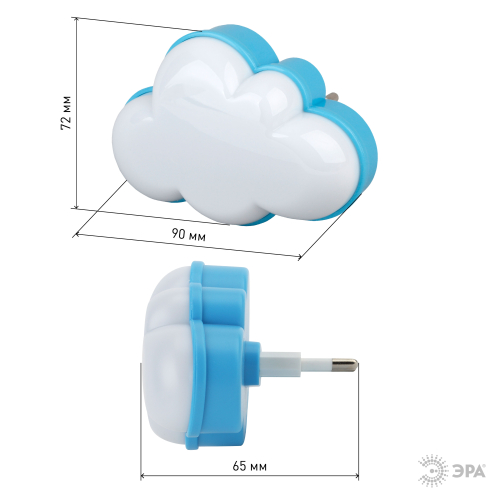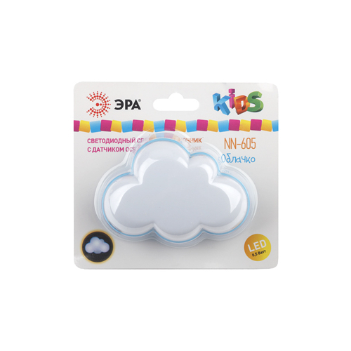 Ночник ЭРА в виде облачка - идеальный подарок для ребенка. Детский светодиодный ночник светильник в розетку с датчиком освещенности ЭРА представлен в 7-ми вариациях: модель NN-605-LS-W – Облачко; модель NN-626-LS-Y – Бычок, модель NN-601-LS-R - Божья коровка; модель NN-607-LS-BU – Воздушный шар; модель NN-603-LS-W – Белый мишка; модель NN-606-LS-W – Клевер; модель NN-631-LS-P – Хрюшка.