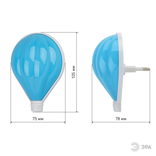 Ночник ЭРА в виде воздушного шара - идеальный подарок для ребенка. Детский светодиодный ночник светильник в розетку с датчиком освещенности ЭРА представлен в 7-ми вариациях: модель NN-605-LS-W – Облачко; модель NN-626-LS-Y – Бычок, модель NN-601-LS-R - Божья коровка; модель NN-607-LS-BU – Воздушный шар; модель NN-603-LS-W – Белый мишка; модель NN-606-LS-W – Клевер; модель NN-631-LS-P – Хрюшка.