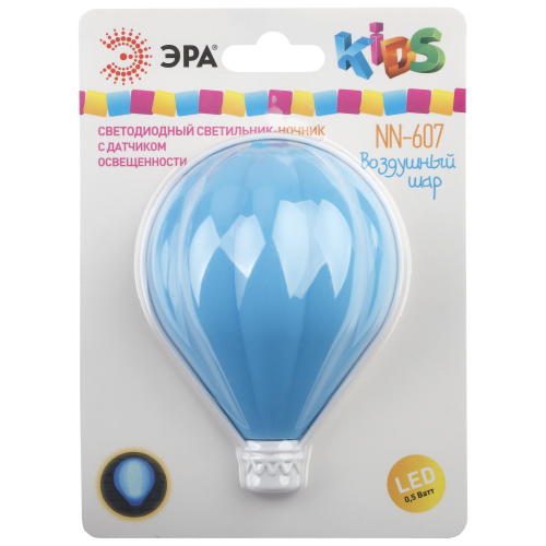 Ночник NN-607-LS-BU "Воздушный шар" со светодиодами (LED) в качестве источников света и встроенным датчиком освещенности. Включается автоматически, если вокруг темно, и так же сам гаснет с рассветом. Среди множества вариантов ночников миниатюрные модели, вставляющиеся в розетку - одни из самых удобных. Светодиодные ночники ЭРА успешно выполняют свою основную функцию - создают мягкий рассеянный свет. Они отличаются мизерным энергопотреблением, которое будет незаметно в общем счете за электроэнергию. При необходимости можно смело оставлять их включенными ночи напролет. Современная LED технология исключает пульсации света, освещение ровное и приглушенное - то, что нужно для комфортного сна или ночной подсветки. Упаковка позволяет проверить работу ночника, не доставая его из блистера, нужно только включить его в розетку и прикрыть датчик освещенности рукой.