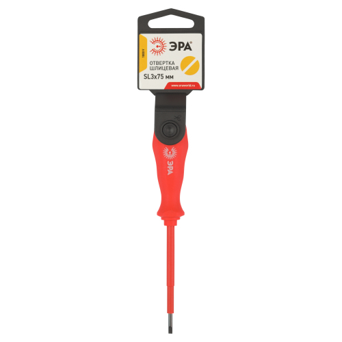 Диэлектрическая шлицевая отвертка ЭРА SL 3х75. Современная эргономичная отвертка для работы с электрооборудованием. Изоляционное покрытие позволяет осуществлять работы под напряжением до 1500 В переменного / 1000 В постоянного тока.
