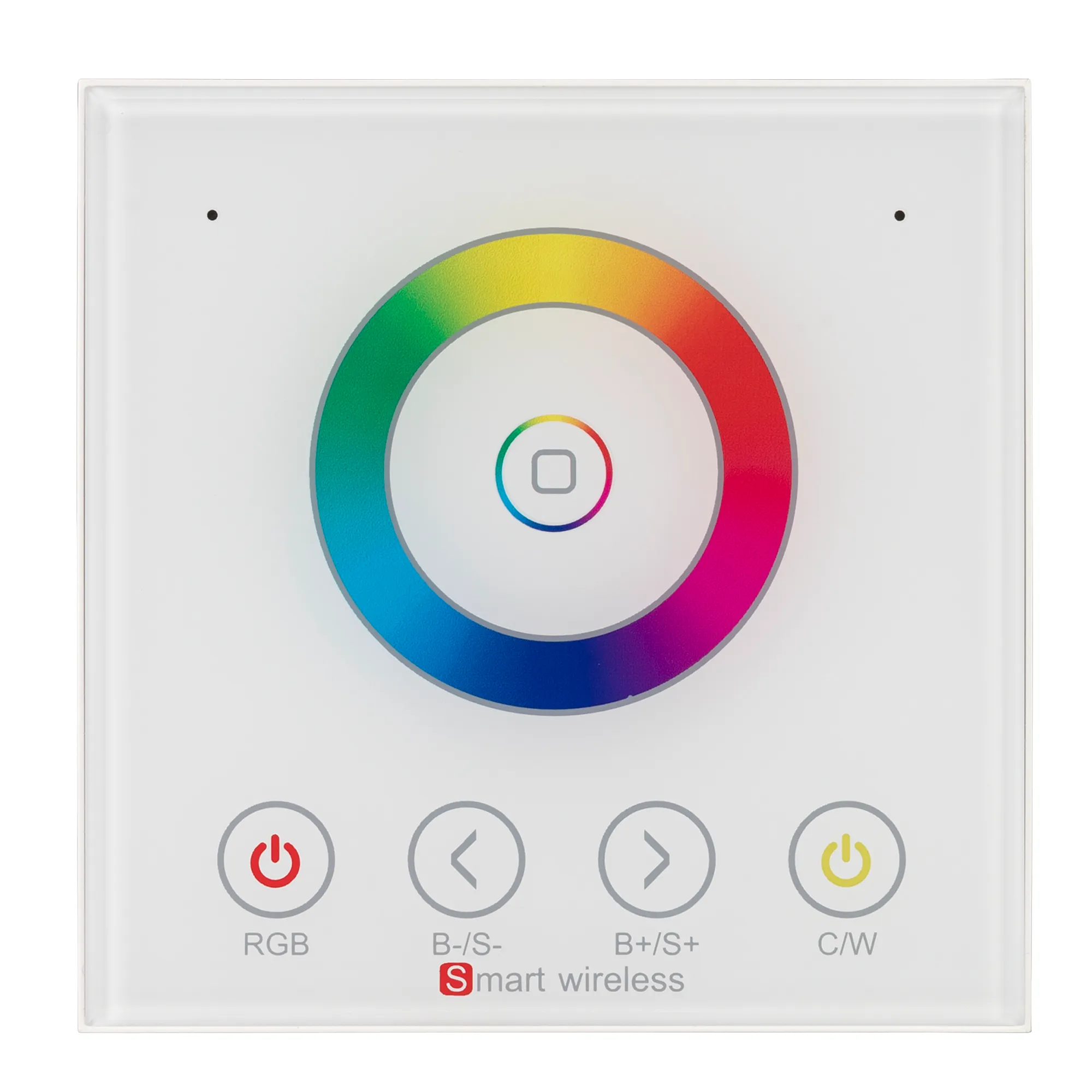 Настенная сенсорная панель со стекляным покрытием предназначена для встройки в стандартный подрозетник. С помощью панели возможно управление 4-х канальной мультицветной RGBW светодиодной лентой - включение/выключение, регулировка яркости, изменение цвета. Панель имеет сенсорный круг для точного и легкого изменения цвета свечения, кнопки включения и выключения света. Изделие выполнено в белом цвете из высококачественного стекла, устойчивого к появлению мелких царапин и сколов. Питание панели имеет диапазон напряжений от 12В до 24В, максимальный ток 4А на 1 канал, максимальная мощность 192-384Вт (в зависимости от напряжения питания). Габариты панели составляют 89х89х40мм.