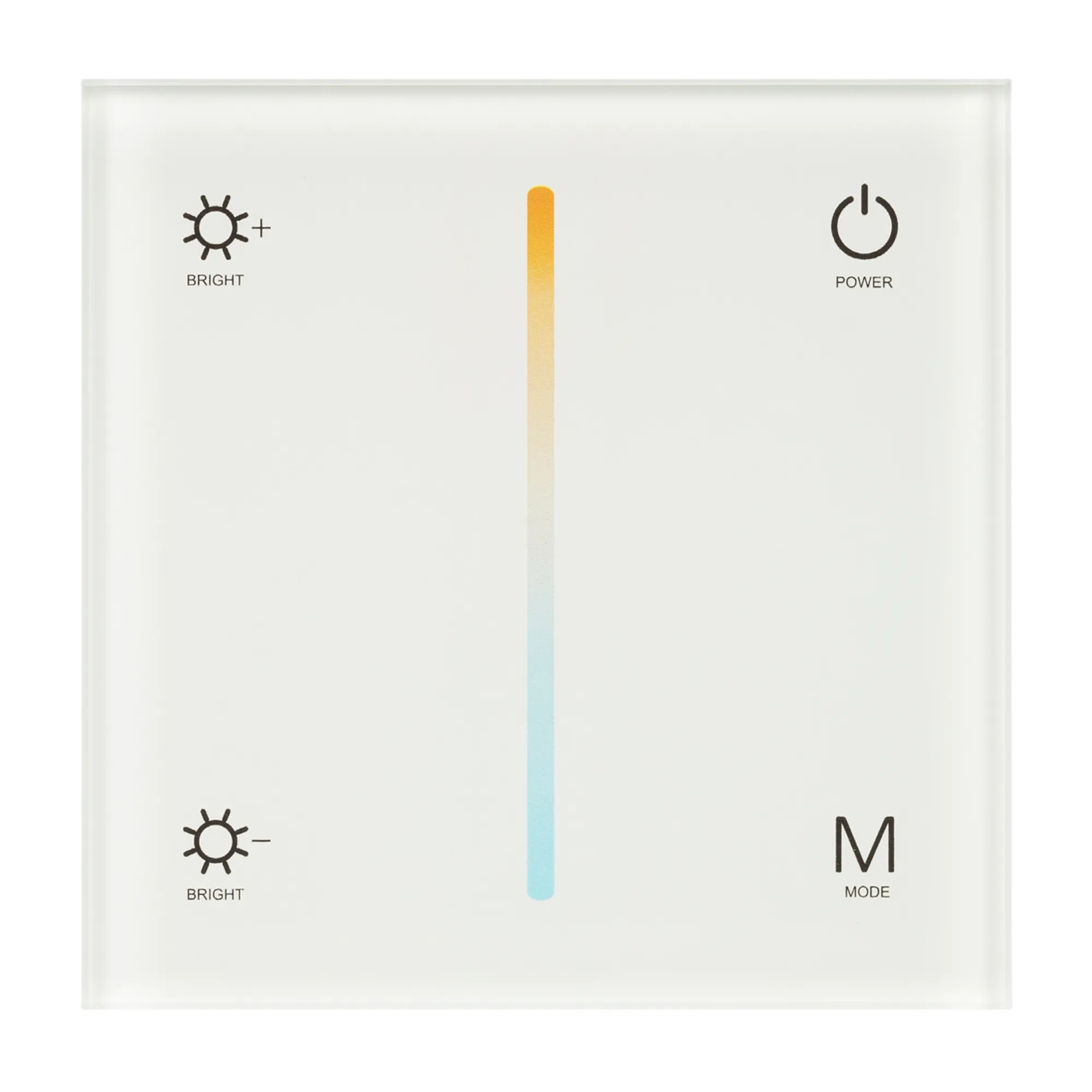 Встраиваемая сенсорная панель белого цвета из стекла, с защитой от мелких царапин. Предназначена для управления мультибелыми (MIX) источниками света (ШИМ) с помощью сенсорной полосы. Основные функции: включение/выключение света, регулировка яркости, изменение цветовой температуры. Изделие можно использовать как диммер с 2 парами параллельных выходов для подключения мультибелых светодиодных лент. Возможно применение как однозонный пульт дистанционного управления диммерами и контроллерами серии SMART. Устройство может управляться пультами дистанционного управления или другими панелями серии SMART. К одной панели возможно привязать неограниченное количество диммеров и контроллеров, совместима с диммерами и контроллерами серии SMART, с управлением по радиоканалу 2.4G. Питание 12-24В, 4 канала управления, максимальный ток 3А на канал, суммарная мощность нагрузки 144-288 Вт. Габариты: 86х86х35 мм, корпус пластика, лицевая часть из стекла. Установка в монтажные коробки стандартного размера.