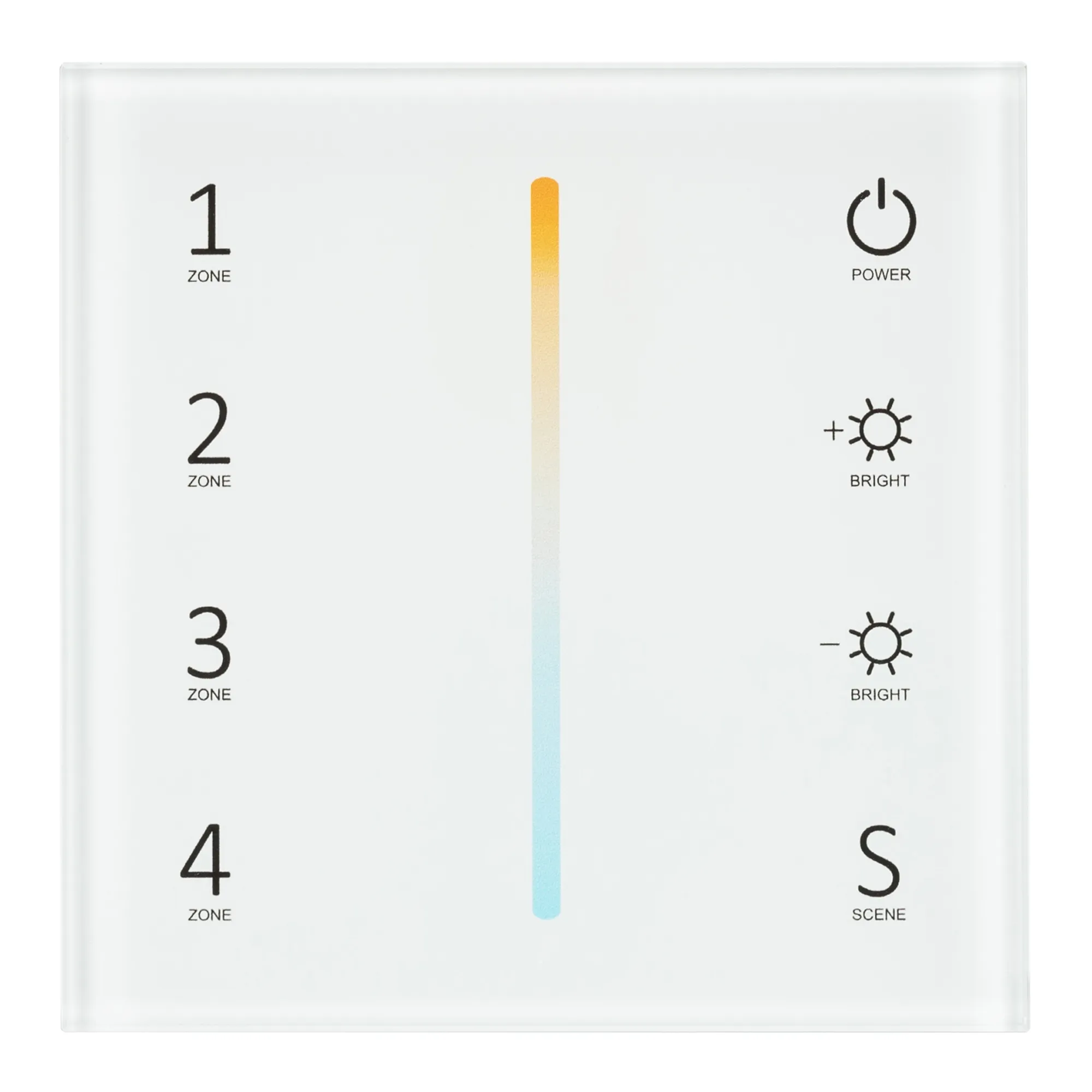 Встраиваемая сенсорная панель, изготовленная из высококачественного стекла, защищенного от появления царапин. Изделие позволяет осуществлять основные функции управления светом: включение/выключение, регулировка яркости, регулировка цветовой температуры, сохранение предустановок для 4 световых зон. Панель совместима с диммерами и контроллерами SMART по радиоканалу 2.4G (количество привязываемых диммеров и контроллеров не ограничено) и может управлять DMX-диммерами по проводной шине DMX512. Выходной сигнал DMX соответствует стандартному протоколу DMX512 и совместим с оборудованием DMX любого производителя. Панель белого цвета, питание от сети 230В. Габариты устройства 86х86х35 мм, встраивается в стандартную монтажную коробку.