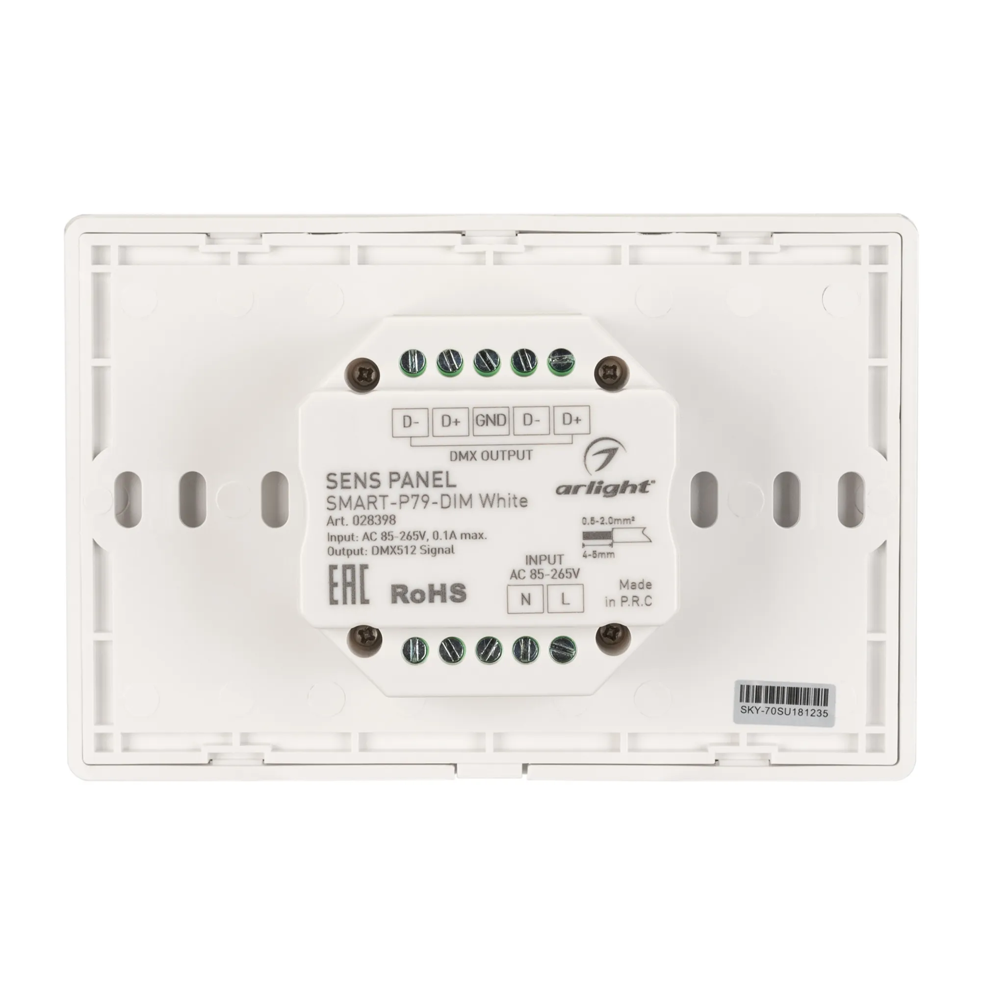 Встраиваемая сенсорная панель в "итальянском" стиле, изготовленная из высококачественного стекла, защищенного от появления царапин. Изделие позволяет осуществлять основные функции управления светом: включение/выключение, регулировка яркости, сохранение предустановок для 4 световых зон. Панель совместима с диммерами и контроллерами SMART по радиоканалу 2.4G (количество привязываемых диммеров и контроллеров не ограничено) и может управлять DMX-диммерами по проводной шине DMX512. Выходной сигнал DMX соответствует стандартному протоколу DMX512 и совместим с оборудованием DMX любого производителя. Панель белого цвета, питание от сети 230В. Габариты устройства 120х80х37 мм, встраивается в стандартную монтажную коробку.