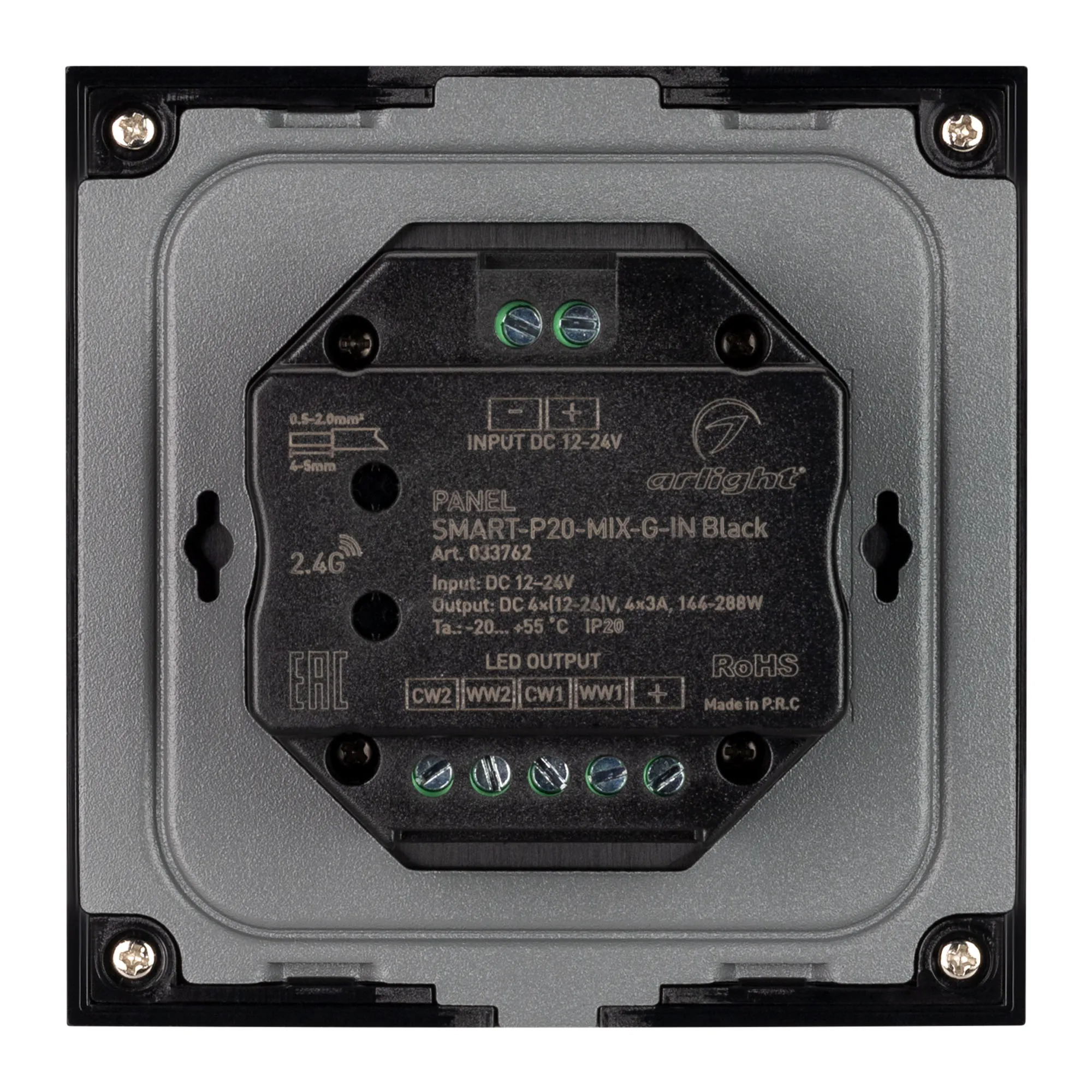 Встраиваемая роторная панель черного цвета из стекла, с защитой от мелких царапин. Предназначена для управления мультибелыми (MIX) источниками света (ШИМ) с помощью роторного вращателя. Основные функции: включение/выключение света, регулировка яркости, изменение цветовой температуры. Изделие можно использовать как диммер с 2 парами параллельных выходов для подключения мультибелых светодиодных лент или в качестве однозонного пульта управления диммерами и контроллерами серии SMART. Устройство может управляться пультами дистанционного управления или панелями серии SMART. К одной панели можно привязать неограниченное количество диммеров и контроллеров. Устройство совместимо с диммерами и контроллерами серии SMART, с управлением по радиоканалу 2.4G. Питание 12-24В, 4 канала управления, максимальный ток 3А на канал, суммарная мощность нагрузки 144-288 Вт. Габариты: 86х86х50 мм, корпус из пластика, лицевая часть из стекла. Устройство устанавливается в стандартного размера монтажные коробки.