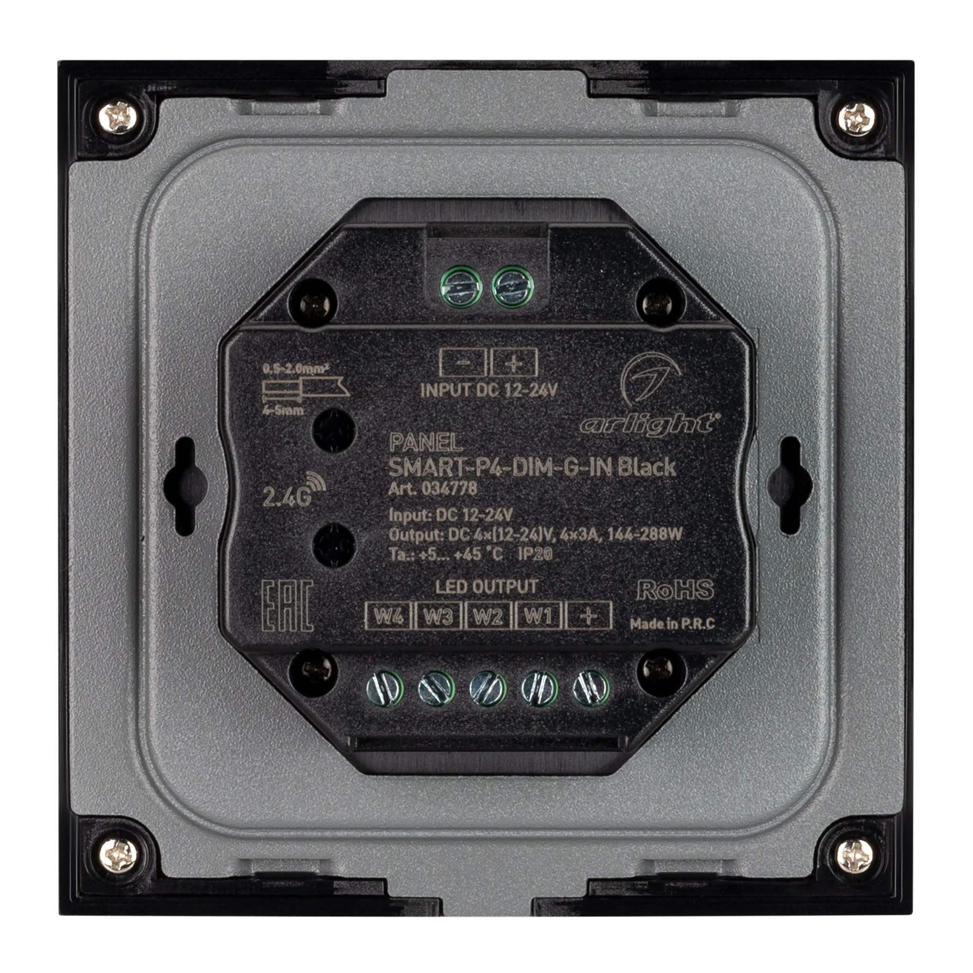 Встраиваемая сенсорная панель чёрного цвета из стекла, с защитой от мелких царапин. Предназначена для управления одноцветными источниками света (ШИМ) с помощью сенсорного кольца. Основные выполняемые функции: включение и выключение света, регулировка яркости. Изделие может использоваться как диммер с 4 параллельными выходами для подключения одноцветных светодиодных лент. Возможно применение в качестве однозонного пульта дистанционного управления диммерами и контроллерами серии SMART. Устройство может управляться пультами дистанционного управления или панелями серии SMART. К одной панели возможно привязать неограниченное количество диммеров и контроллеров, совместимо с диммерами и контроллерами серии SMART, поддерживающими управление по радиоканалу 2.4G. Питание 12-24В, 4 канала управления, максимальный ток 3А на канал, суммарная мощность нагрузки 144-288 Вт. Габариты: 86х86х33 мм, корпус из пластика, лицевая часть из стекла. Установка в монтажные коробки стандартного размера.
