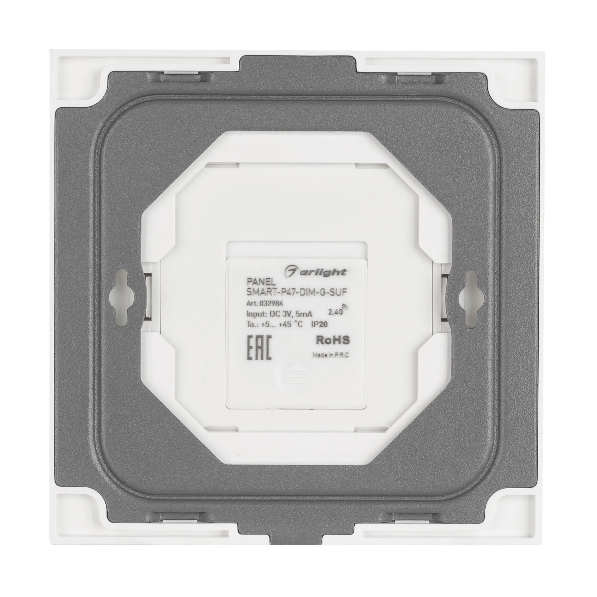 Накладная роторная панель белого цвета, изготовленная из пластика и стекла, защищенного от появления мелких царапин. Предназначена для управления одноцветными источниками света (ШИМ) с помощью кнопок. Основные выполняемые функции: включение и выключение света, регулировка яркости. Удобное и точное управление с помощью эргономичных кнопок. Изделие применяется в качестве 2-зонного пульта дистанционного управления диммерами и контроллерами серии SMART. К одной панели возможно привязать неограниченное количество диммеров и контроллеров. Устройство совместимо с диммерами и контроллерами серии SMART, поддерживающими управление по радиоканалу 2.4G. Питание 3В осуществляется от батарейки CR2025. Габариты панели 86х86х15 мм, корпус выполнен из пластика, лицевая часть - из пластика, рамка - из стекла. Устройство устанавливается на любую поверхность, к которой возможно прикрутить монтажную базу панели.