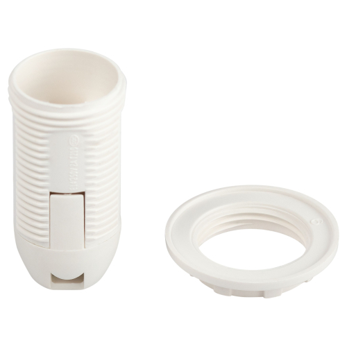 патрон с кольцом изготавливается из термостойкого пластика, материал химически устойчивый к агрессивным средам, обладает высокой прочностью и теплостойкостью; не обладает способностью выдерживать высокие температуры нагрева, поэтому его чаще всего используют для ламп накаливания мощностью не более 60 Вт