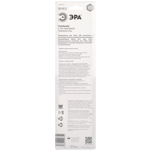 Электропаяльник с регулировкой температуры ЭРА PL-R-60W предназначен для пайки медных проводников и монтажа электронных компонентов в электротехнике. Мощность паяльника 60 Вт он отлично подойдет как для профессиональных монтажных работ, так и для бытового использования. Функция регулировки рабочей температуры жала в диапазоне 200...450°C позволяет подбирать оптимальный режим для различных видов пайки. Корпус паяльника выполнен из ударопрочного, термостойкого пластика. Паяльник оснащён долговечным жалом из меди со специальным защитным покрытием. Конструкция паяльника позволяет при необходимости произвести замену жала.
