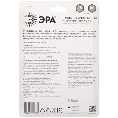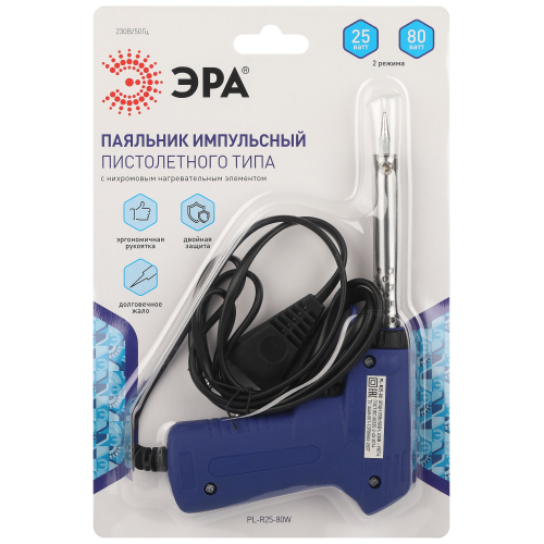 Электропаяльник пистолетного типа ЭРА PL-R25-80W с двумя режимами мощности 25 Вт и 80 Вт отлично подойдет для проведения различных паяльных работ в домашних условиях или мастерской. Паяльник оснащён медным жало со специальным защитным покрытием. Конструкция паяльника позволяет при необходимости произвести замену жала. Ручка паяльника в форме пистолета удобна в обхвате и обеспечивает легкость при работе. Корпус паяльника выполнен из ударопрочного, термостойкого пластика. На корпусе паяльника расположен индикатор включения.