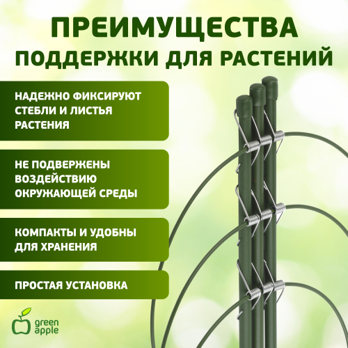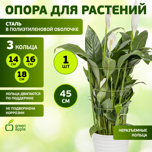 Поддержка для цветов состоит из 3-х колец и используется в качестве опоры для садовых и комнатных растений. Благодаря пластиковому покрытию она не подвержена воздействию окружающей среды. За счет зеленого цвета поддержка не отвлекает на себя внимание, легко маскируется среди ветвей. Кольцевая опора для растений высотой 45 см используется в качестве поддержки раскидистых культур. Отличается прочностью, устойчивостью к агрессивному воздействию окружающей среды. Не гниет, не имеет ограничений по сроку годности. Хорошо выдерживает вес растений, не деформирует листовые пластины и стебли. Цвет: зеленый.