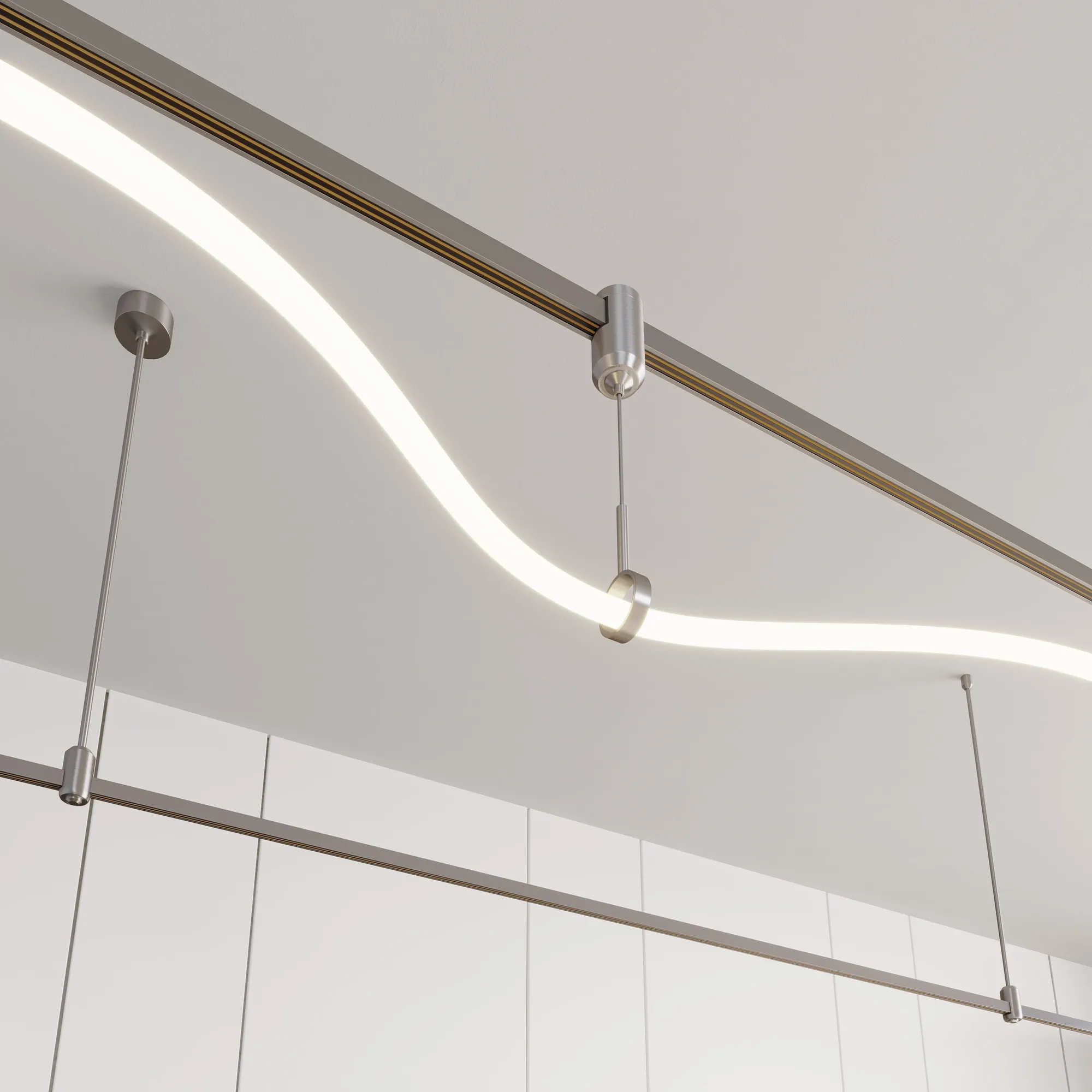 Подвес гибкий HANG-TUBE с регулируемым тросом длиной 1500 мм для монтажа светильников TUBE ELASTIC к потолку или другой поверхности. Размер Ø20 х 1500 х Ø45 мм. Размер потолочного крепления: Ø20 х 35 мм, размер подвесного кольца: Ø45 х 12 мм. Не проводит электричество. Изготавливается из алюминия, анодированного в цвет титан. Максимальная нагрузка 10 кг.