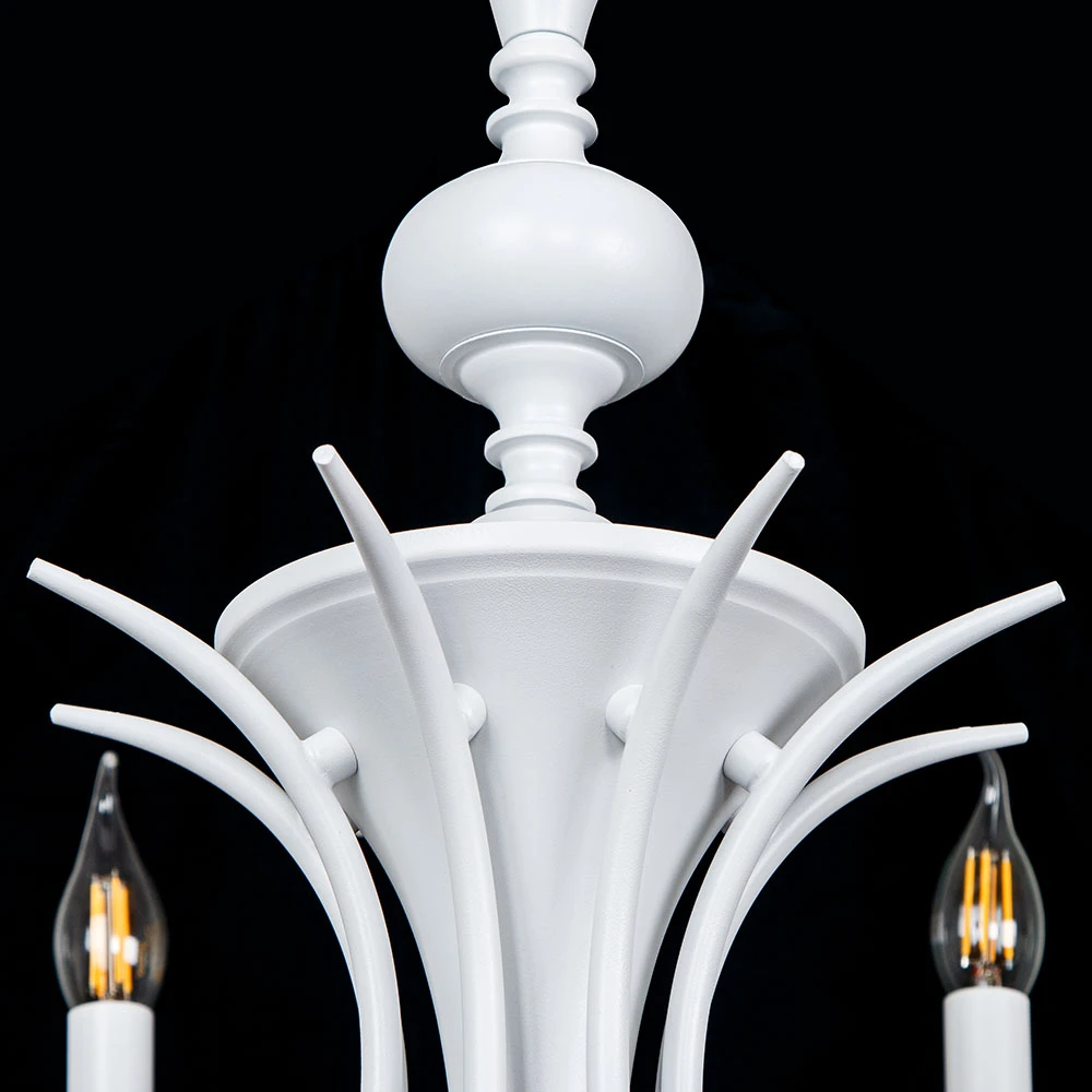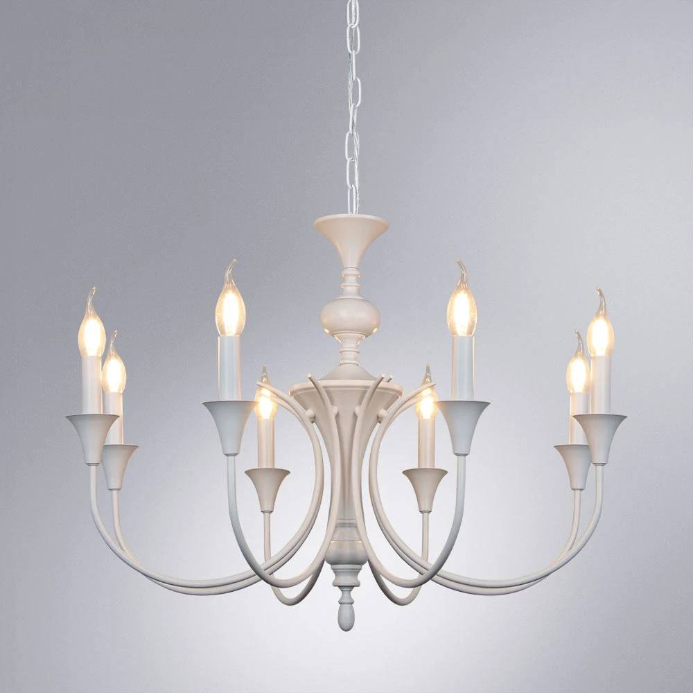 Подвесная люстра COLLINETTA A4094LM-8WH от итальянского бренда ARTE LAMP. Модель в скандинавском стиле с восемью рожками из белого металла. Конструкция без плафонов создает открытый свет, идеальный для создания яркого и равномерного освещения в просторной комнате. Люстра крепится на крюк и использует классические лампы накаливания. Гарантия производителя составляет 36 месяцев.