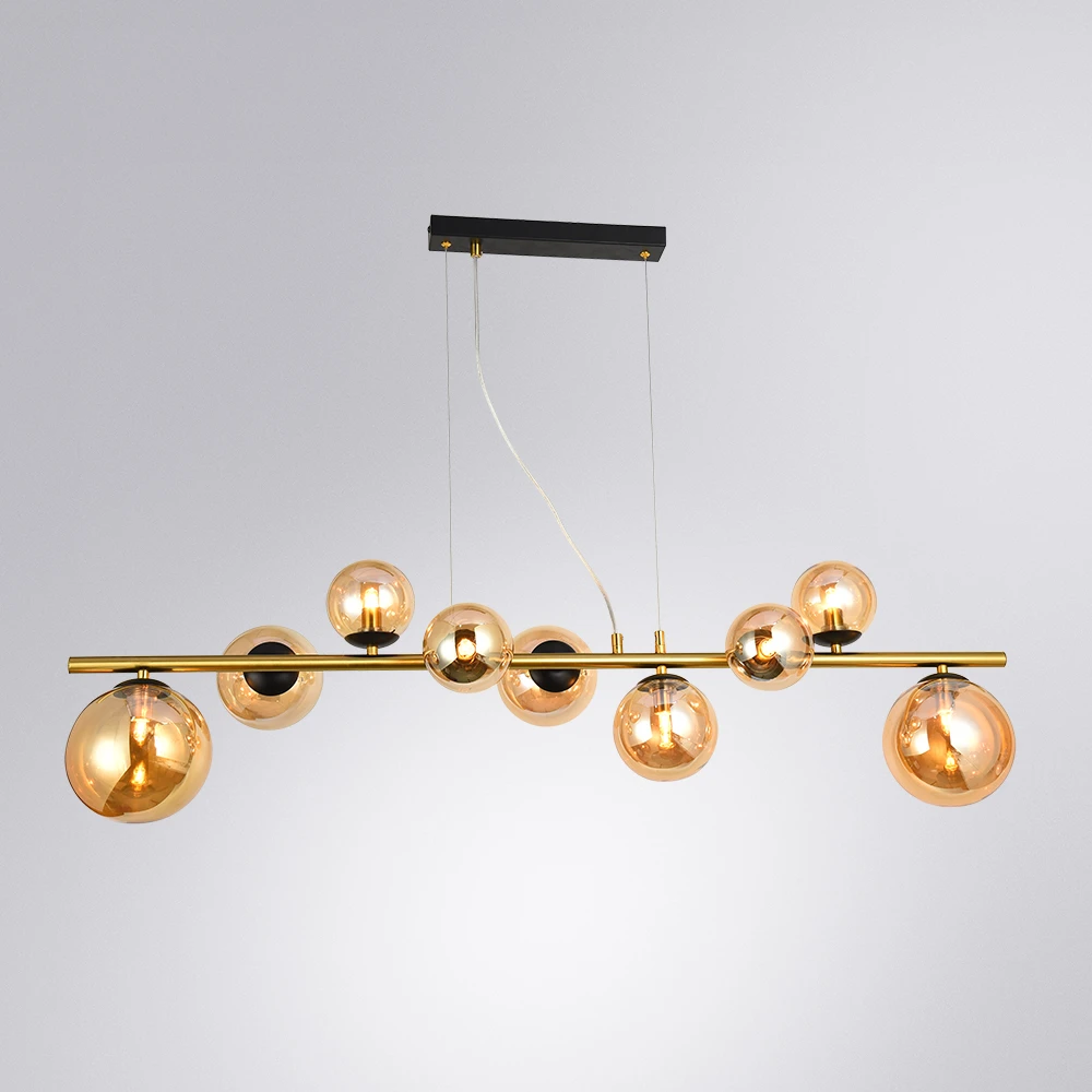 Подвесная люстра Arte Lamp GEMINI A2243SP-9PB в стиле модерн создаст выразительный световой акцент в интерьере. Модель с девятью янтарными стеклянными плафонами, направленными в стороны, излучает теплый и уютный свет. Медное покрытие металлической арматуры гармонично сочетается с теплым тоном стекла, создавая цельную композицию. Люстра крепится на планку и предназначена для галогенных ламп, обеспечивая комфортное освещение. Итальянский бренд гарантирует качество и долговечность своей продукции.