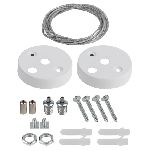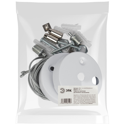 Комплект креплений для магистральных светильников ЭРА SML. В крепёжный набор входят 2 комплекта креплений - для накладного и подвесного монтажа. Длину троса при подвесном монтаже можно регулировать (максимальная длина подвеса светильника - 1 метр).