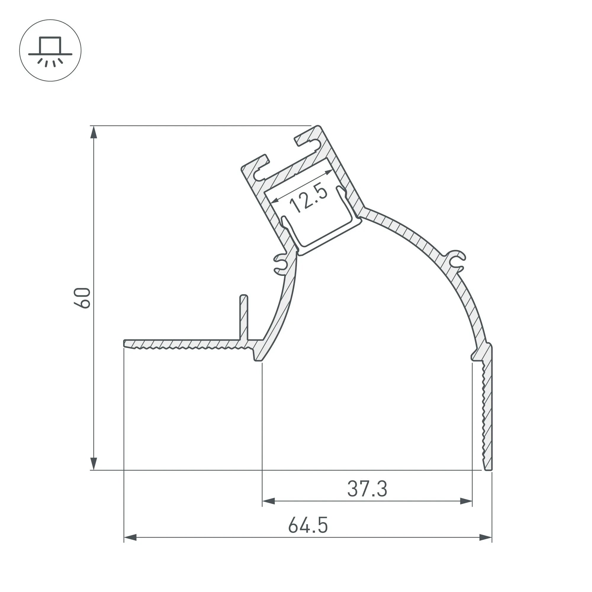 Габаритные размеры профиля составляют 2000 мм в длину, 64,5 мм в ширину и 60 мм в высоту. Площадка для установки светодиодных лент позволяет использовать ленту шириной до 12,5 мм и мощностью до 50 Вт/м. Это обеспечивает гибкость в выборе светодиодных лент и создает потрясающие световые решения.