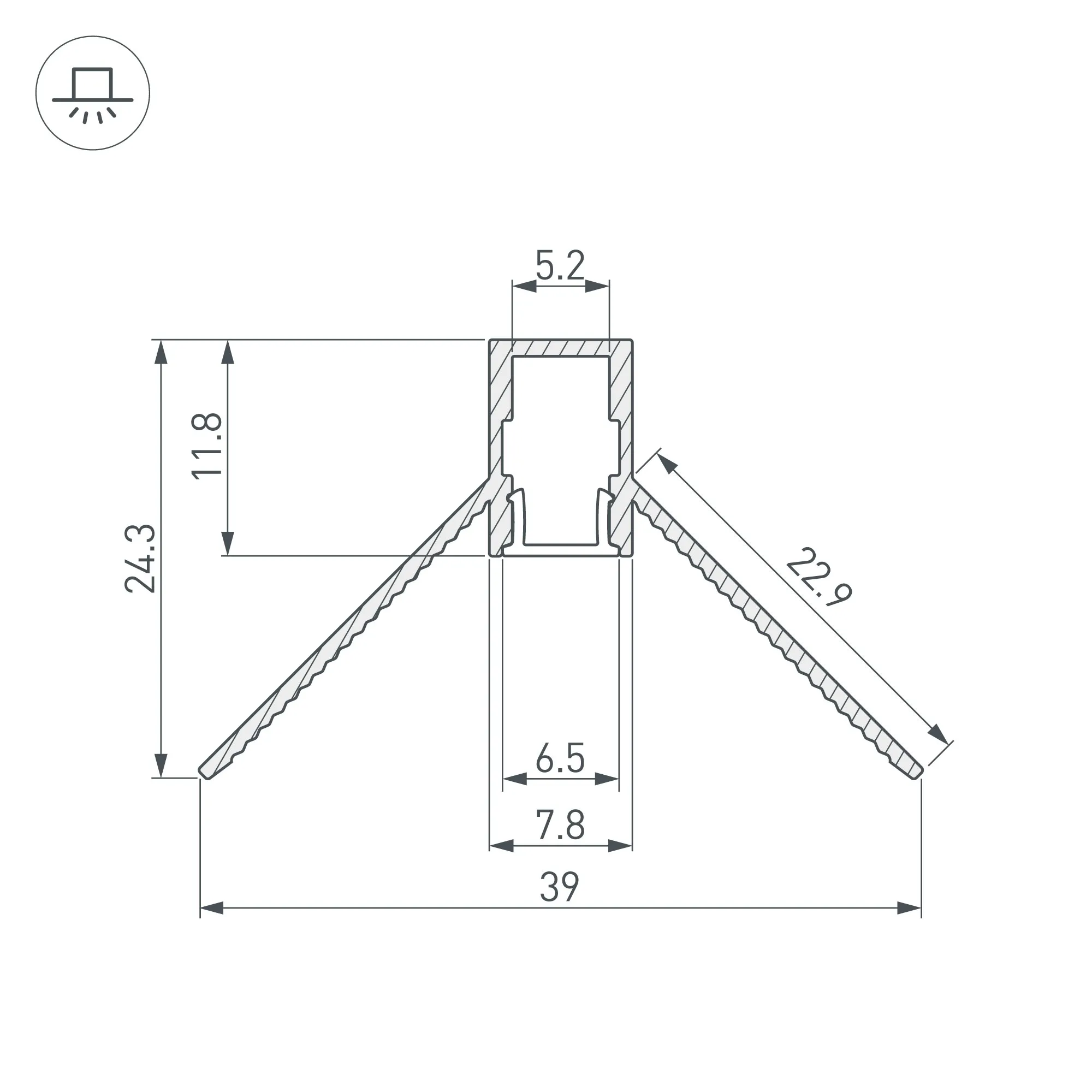 Габаритные размеры этого профиля составляют 2000 мм в длину, 40,3 мм в ширину и 24,3 мм в высоту. Площадка для установки светодиодных лент позволяет использовать ленту шириной до 5,2 мм и мощностью до 27 Вт/м. Это обеспечивает гибкость в выборе светодиодных лент и создает потрясающие световые решения.