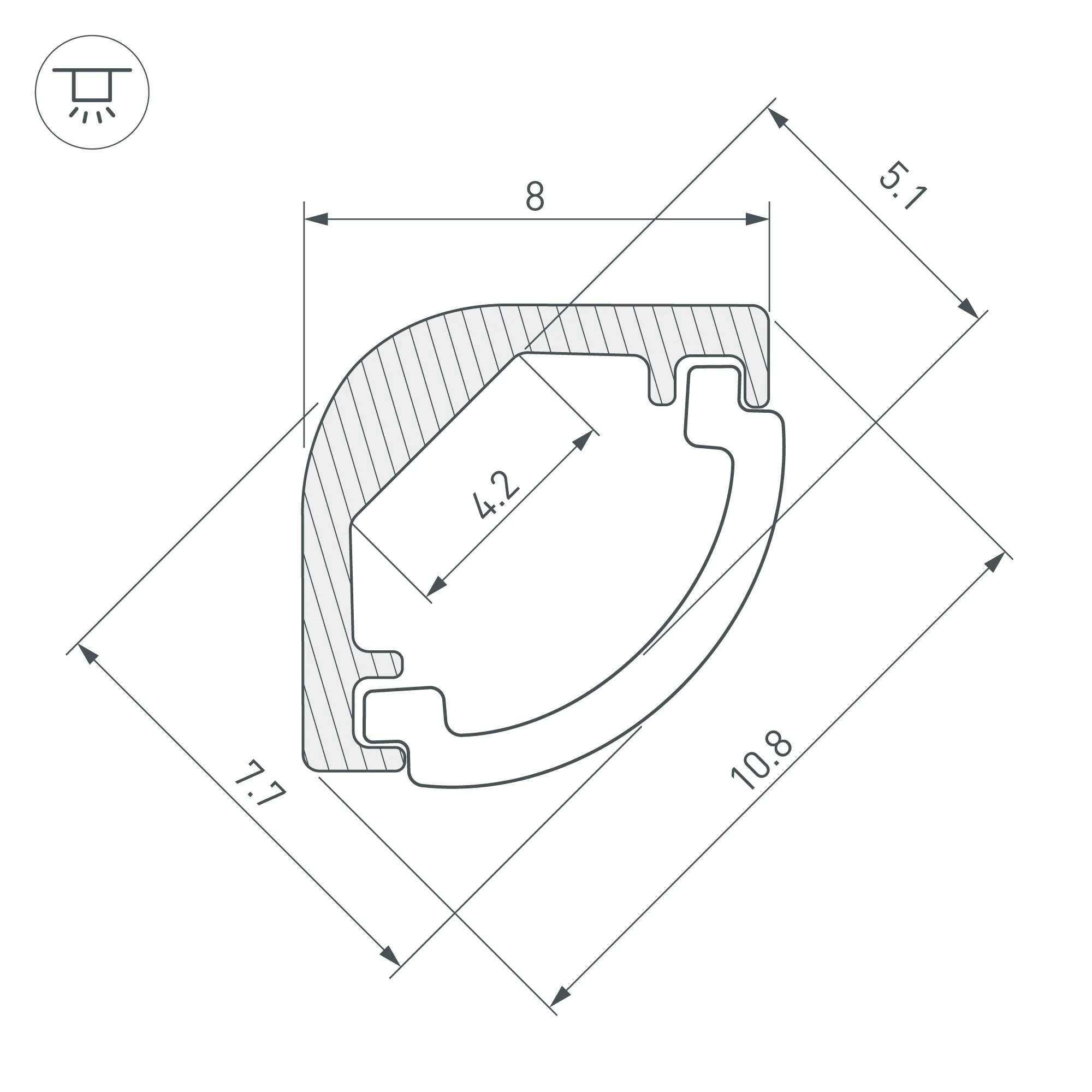 Угловой профиль из анодированного алюминия для подсветки мебели, ниш и других элементов интерьера. Скругленный угол профиля позволяет достичь высокой точности установки при любых неровностях. Габаритные размеры профиля составляют 2000 мм в длину, 8 мм в ширину и 8 мм в высоту. Площадка для установки светодиодных лент позволяет использовать ленту шириной до 4,2 мм и мощностью до 12 Вт/м. Это обеспечивает гибкость в выборе светодиодных лент и создает потрясающие световые решения.