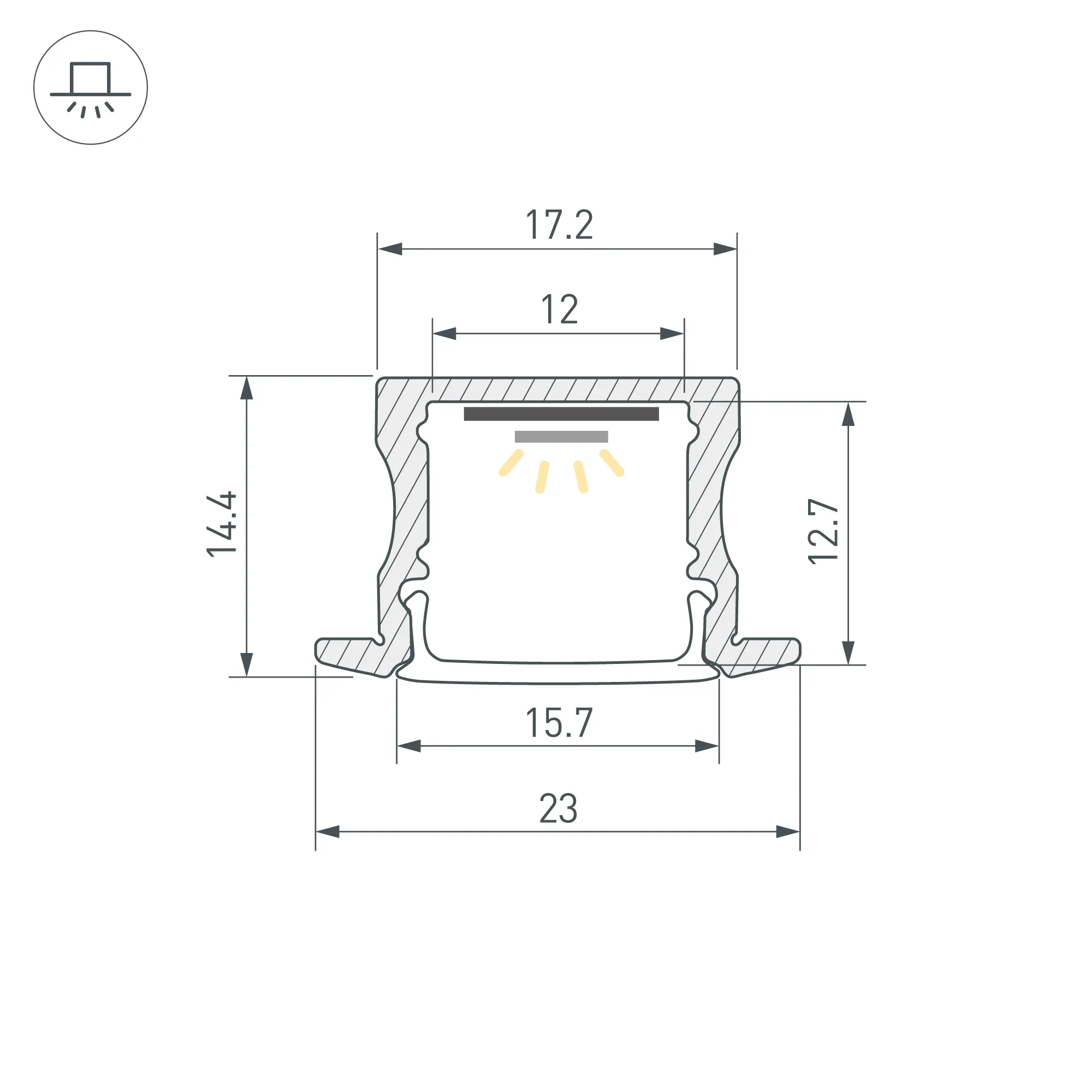 Встраиваемый профиль из анодированного алюминия с накладным фланцем для контурной подсветки элементов интерьера. Габаритные размеры профиля составляют 2000 мм в длину, 23 мм в ширину и 14,5 мм в высоту. Площадка для установки светодиодных лент позволяет использовать ленту шириной до 12,4 мм и мощностью до 17,8 Вт/м. Это обеспечивает гибкость в выборе светодиодных лент и создает потрясающие световые решения.