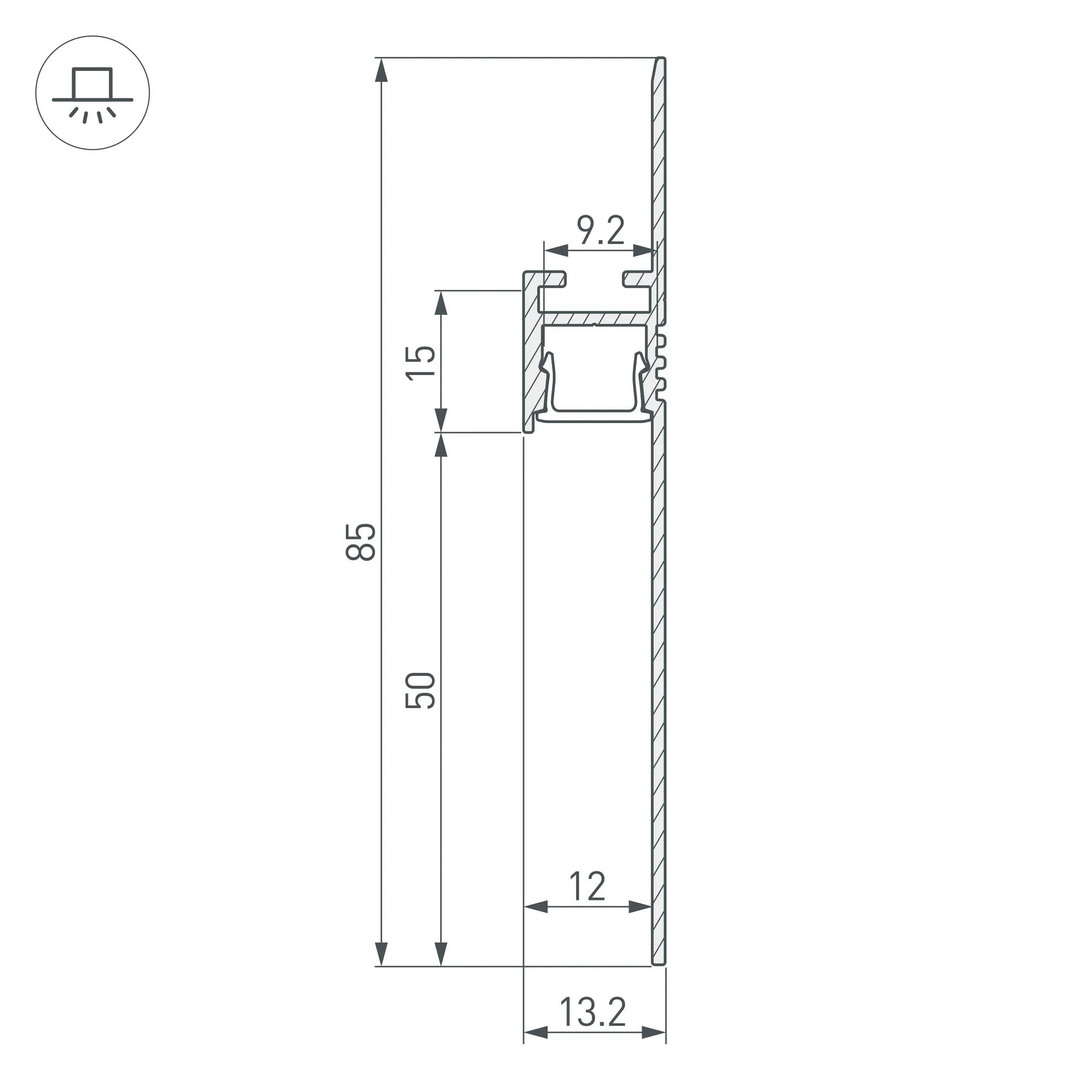 Габаритные размеры профиля составляют 3000 мм в длину, 13,2 мм в ширину и 85 мм в высоту. Высота от пола до световой линии составляет 50 мм.